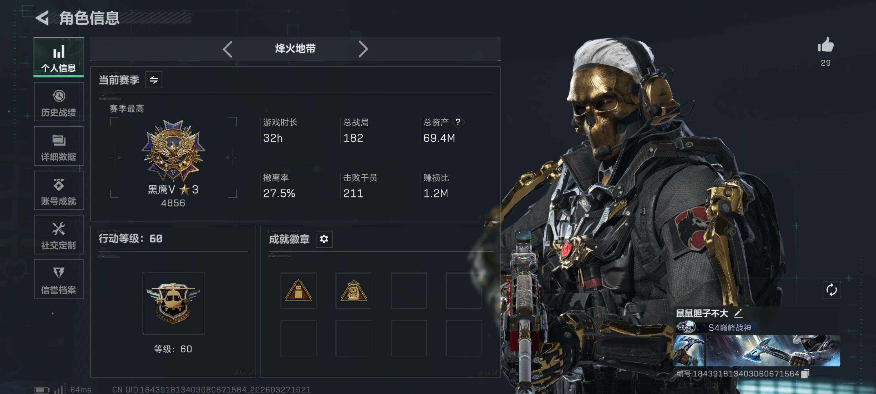 69m总资产-27303k哈夫币-60烽火等级-黑鹰-30战场等级-上等兵
