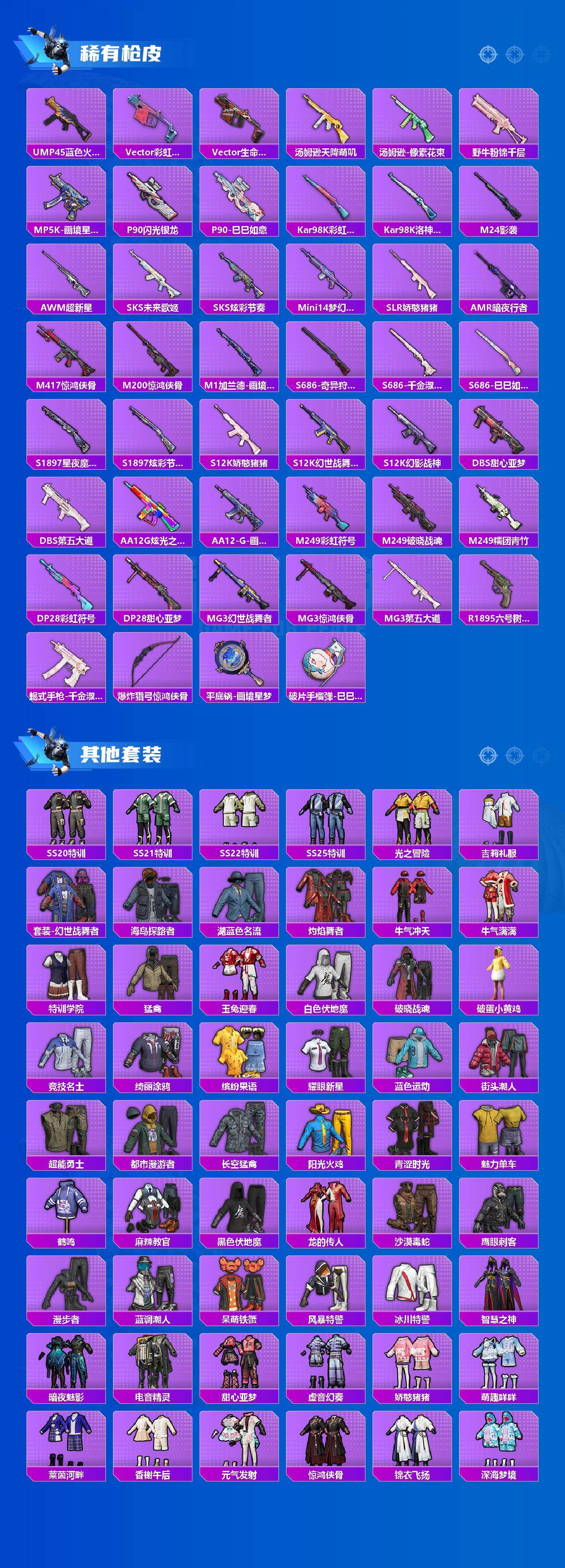 【粉色枪皮等级】:AKM-绿萝繁花(五级),AUG-暖羊咩咩(五级),UMP45-萌骑冒险(三级),AKS-74U-森灵之息(五级),Kar98K-巳巳如意(五级),Mk14-福马献瑞(五级),M417-第五大道(二级)