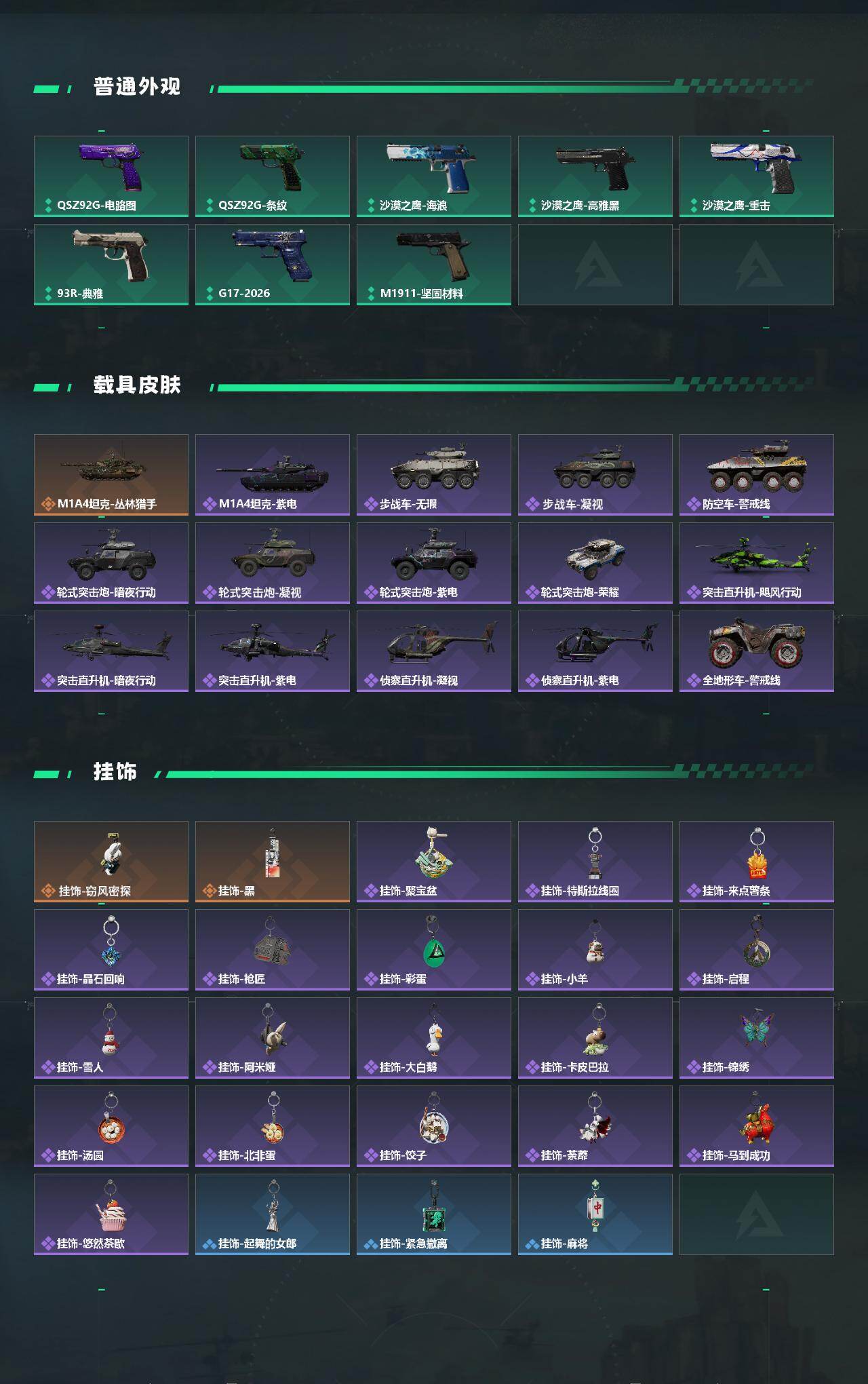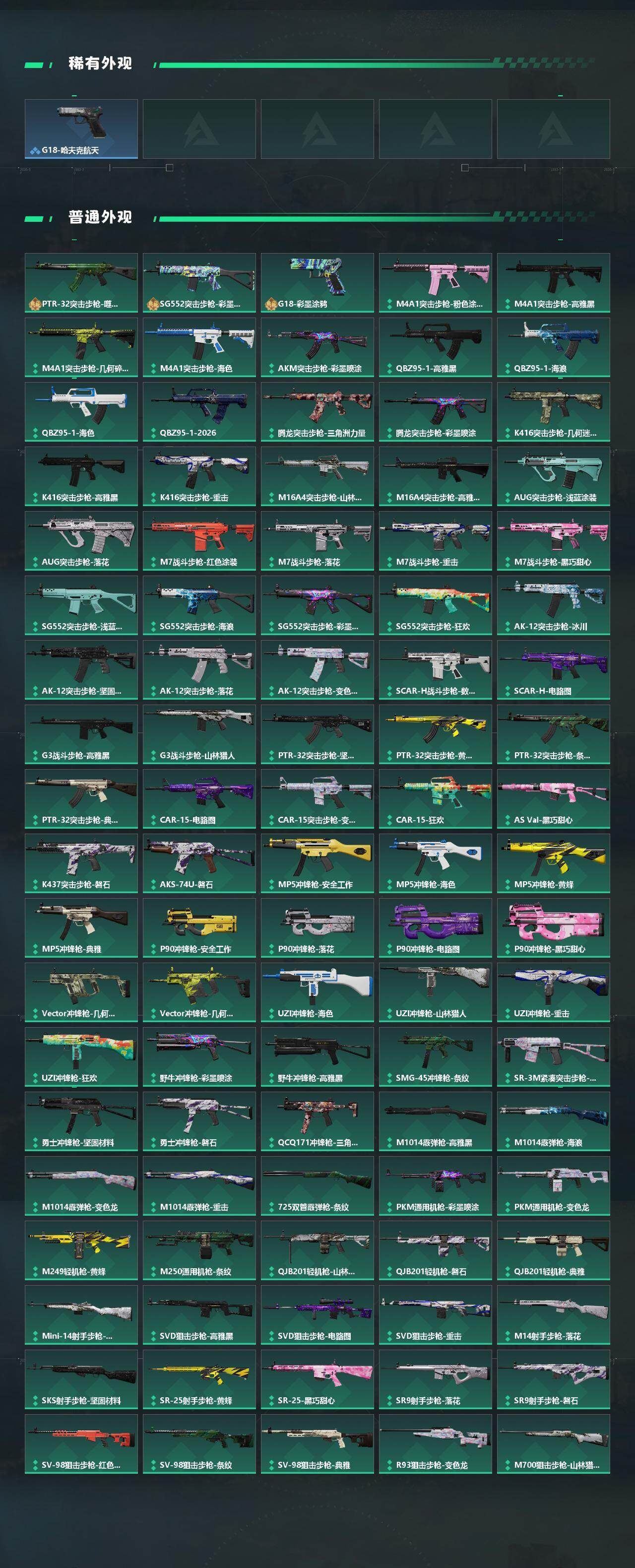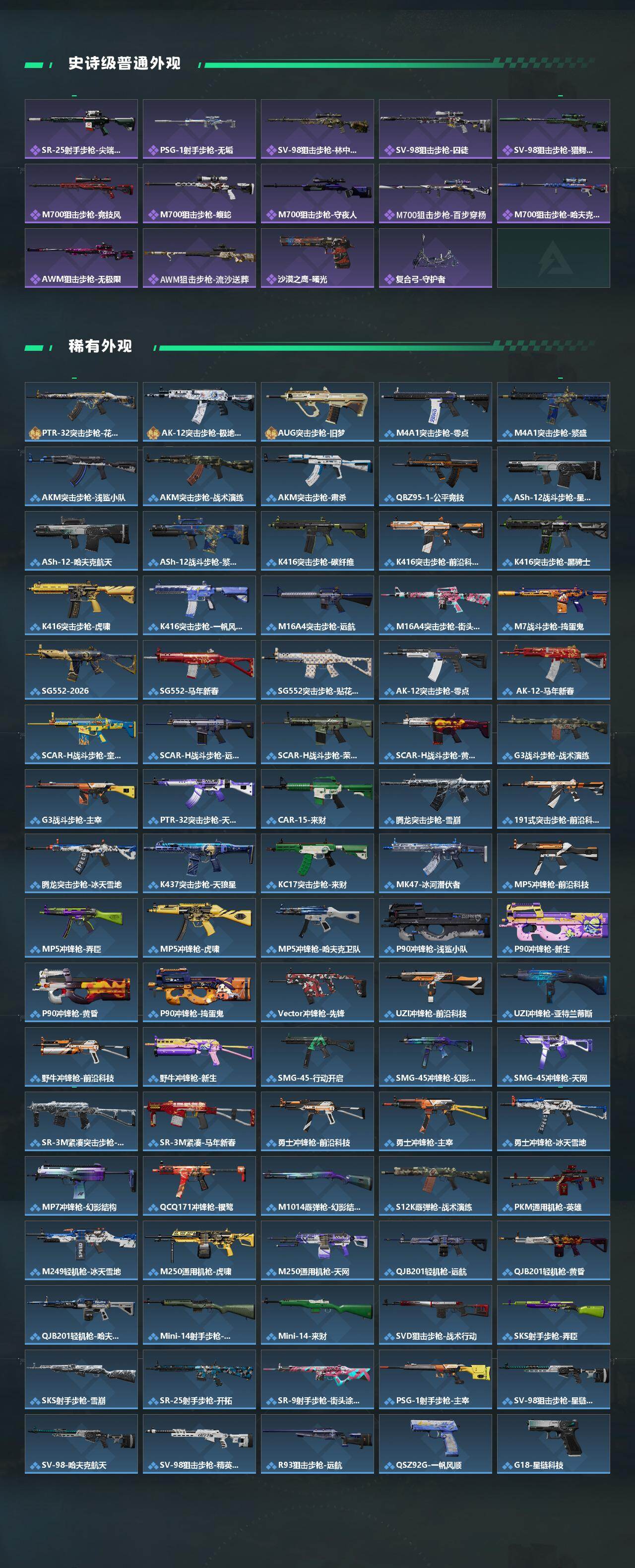 露娜-黑·天际线/蜂医-送葬人·无题密令/无名-夜鹰/深蓝-不破誓约/红狼-电锯惊魂/露娜-金牌射手/乌鲁鲁-荒原猎手/近战-暗星/近战-处刑者1级/近战-黑鹰/M4A1突击步枪-阿米娅/AKM突击步枪-锦绣/ASh-12战斗步枪-鹅鸭杀/K416突击步枪-行动记录/AUG突击步枪-悠然茶歇/SG552突击步枪-运动员/AK-12突击步枪-夜鹰/AK-12突击步枪-特斯拉线圈/SCAR-H战斗步枪