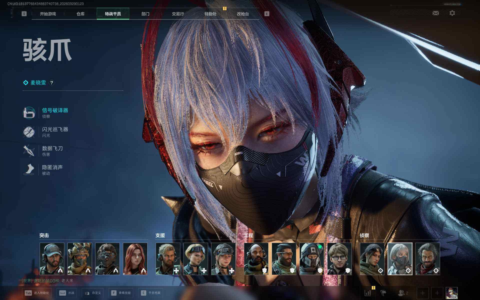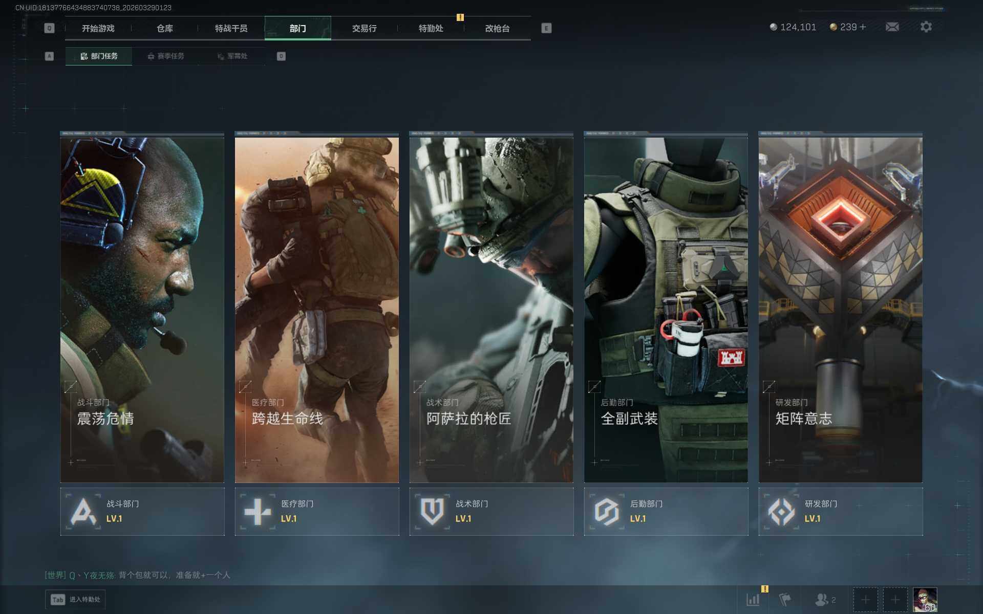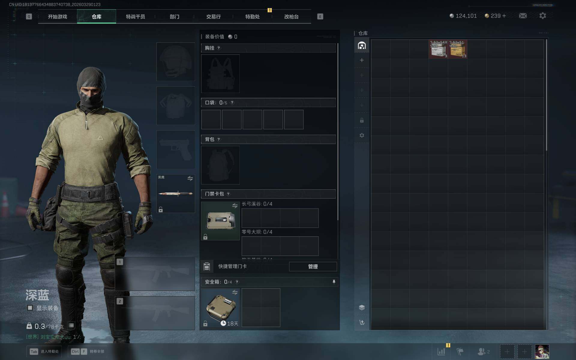 总资产(M):6M/哈夫币(K):124K/传说枪皮数:10/全面战场等级:26_段位:上等兵/烽火地带等级:60_段位:钻石/骇爪-维什戴尔/红狼-电锯惊魂/近战-黑鹰/