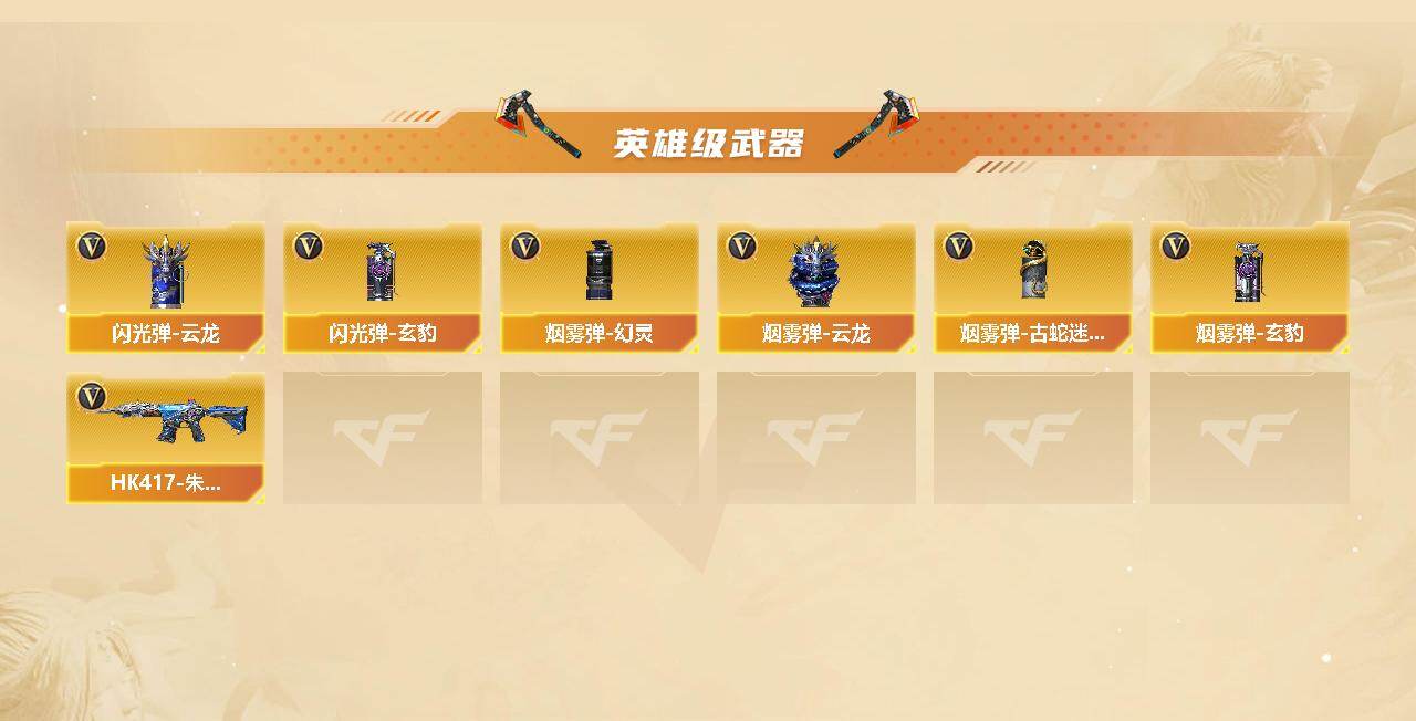 【热门武器】:传说灵眸,传说破晓,G36C-幻影,QBZ03-金色蔷薇*2,Scar Light-白虎,M200-幻神,修罗-古蛇迷踪,荣耀世冠-火麒麟,荣耀世冠-雷神,荣耀世冠-柯尔特,Kar98K-星神,M4A1-黑骑士,RPK-盘龙*4,加特林-炼狱*2,炼狱-枪娘掣电,雷神-小红,USP-雷暴,COP 357-幻灵*2,沙鹰-修罗*2,炽芒蝶刃,炽芒蝶刃-破浪逐光 皮肤