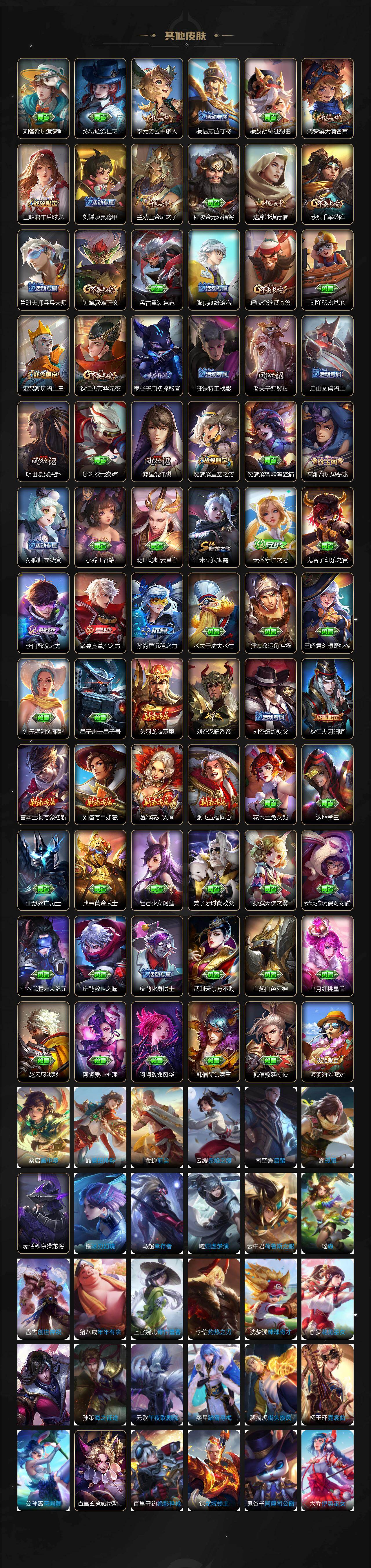 【传说皮肤】:马超神骥逐星野,后羿神树通天,曹操万灵伏威,公孙离云诺千山,司空震愿照山河定,女娲愿照千秋盛,妲己愿照众生和,澜愿照九州拓,蔡文姬愿照福禄聚,虞姬愿照岁时盈,云缨幻光神枪,裴擒虎祥瑞亨通,桑启鸣野蒿,亚连落雪白狼,孙尚香乘龙问璇玑,赵云乘龙铭钟鼎