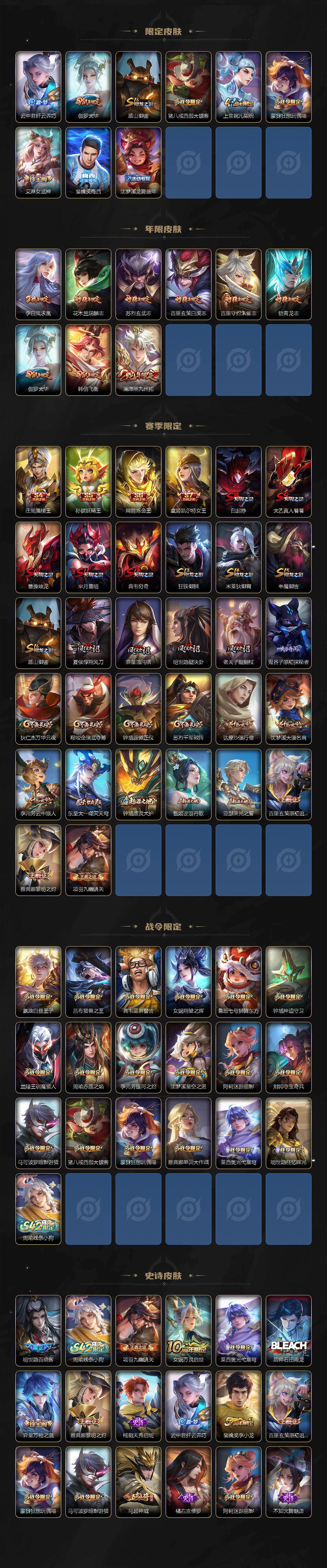 孙悟空-全息碎影/鲁班七号-星空梦想/嫦娥-器灵·落星盏/马超神骥逐星野/后羿神树通天/澜-愿照·九州拓/云缨-幻光神枪/桑启-鸣野蒿/虞姬-启明星使/曜-云鹰飞将/伽罗-太华/貂蝉-猫影幻舞/虞姬-云霓雀翎/达摩-黄金狮子座/百里玄策-白虎志/后羿-黄金射手座/诸葛亮-武陵仙君/貂蝉-仲夏夜之梦/李白凤求凰/孙尚香-末日机甲/宫本武藏-地狱之眼/孙悟空-地狱火/狄仁杰-超时空战士/白起-狰/