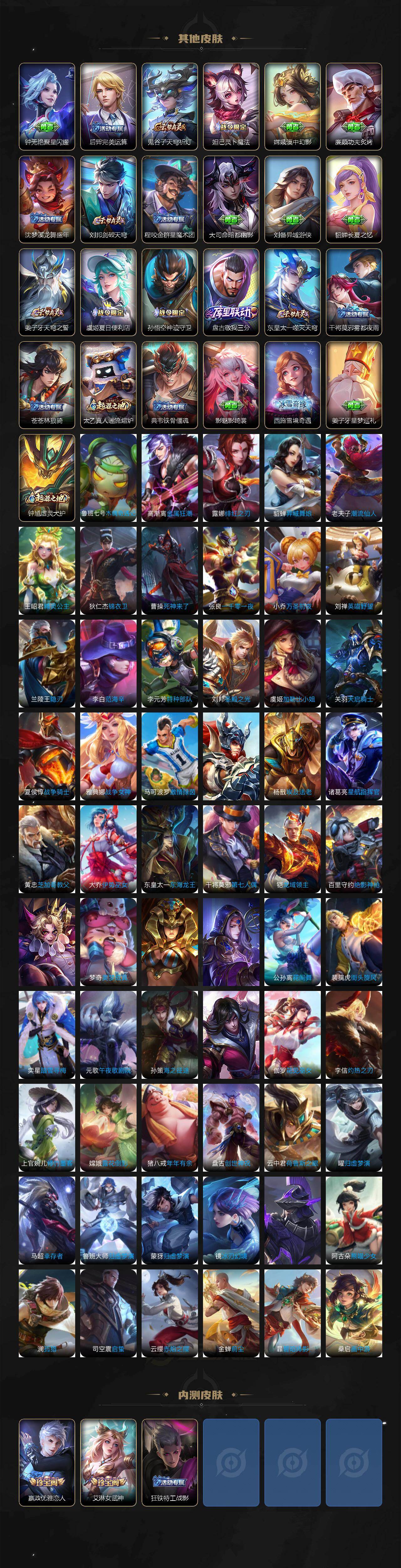 【传说皮肤】:云缨幻光神枪,桑启鸣野蒿,孙尚香异界灵契,貂蝉遇见胡旋,王昭君乞巧织情,公孙离祈雪灵祝,镜炽阳神光,虞姬启明星使,伽罗太华,貂蝉仲夏夜之梦,李白凤求凰,孙尚香末日机甲