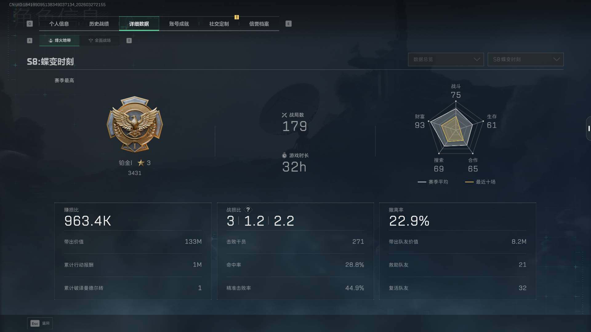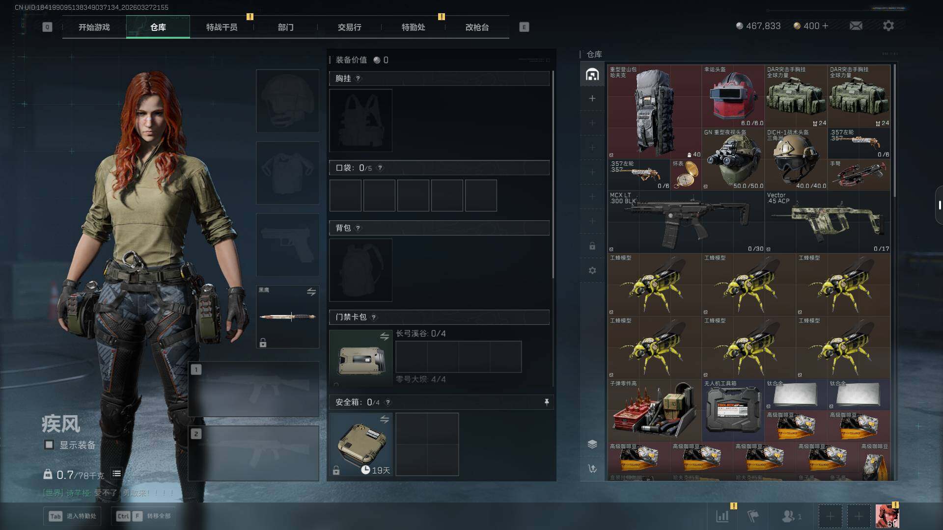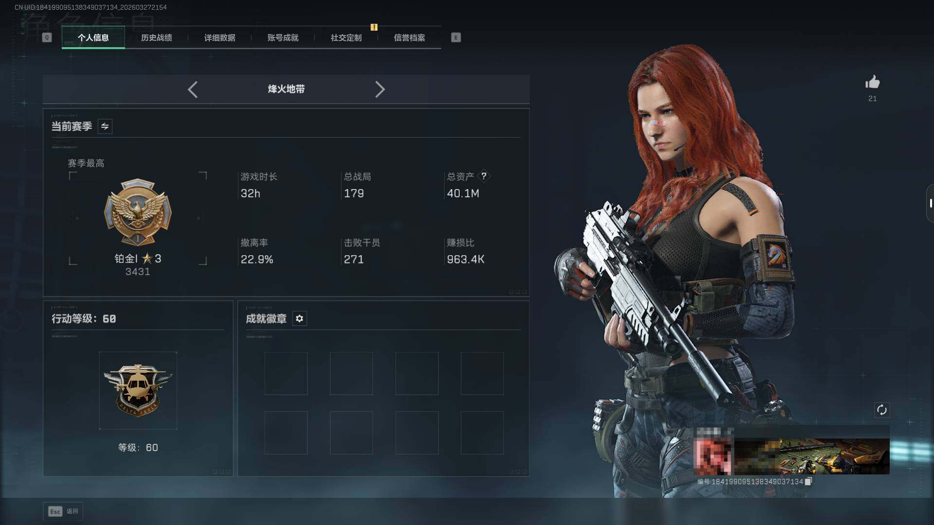 总资产(M):40M/哈夫币(K):467K/传说枪皮数:8/全面战场等级:15_段位:上等兵/烽火地带等级:60_段位:铂金/骇爪-维什戴尔/红狼-电锯惊魂/近战-黑鹰/