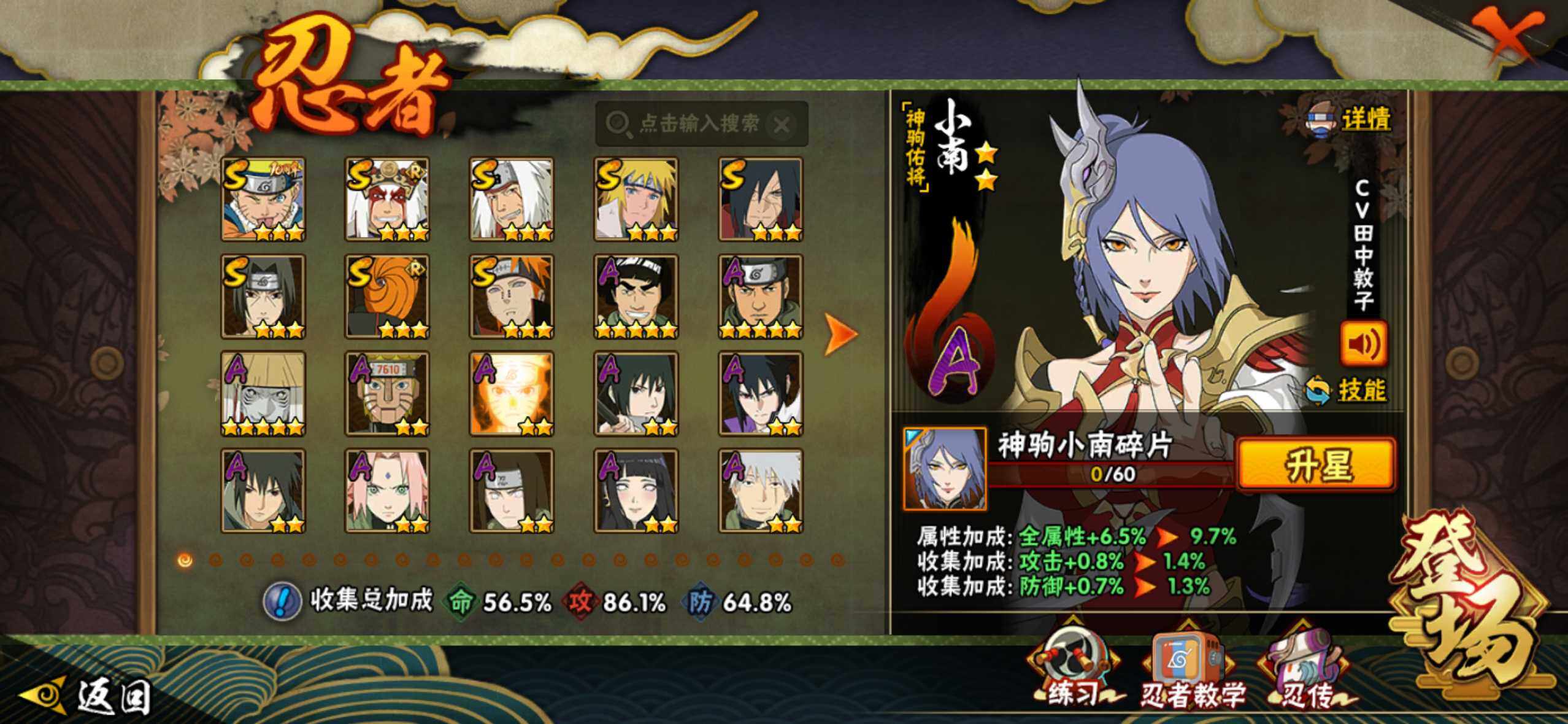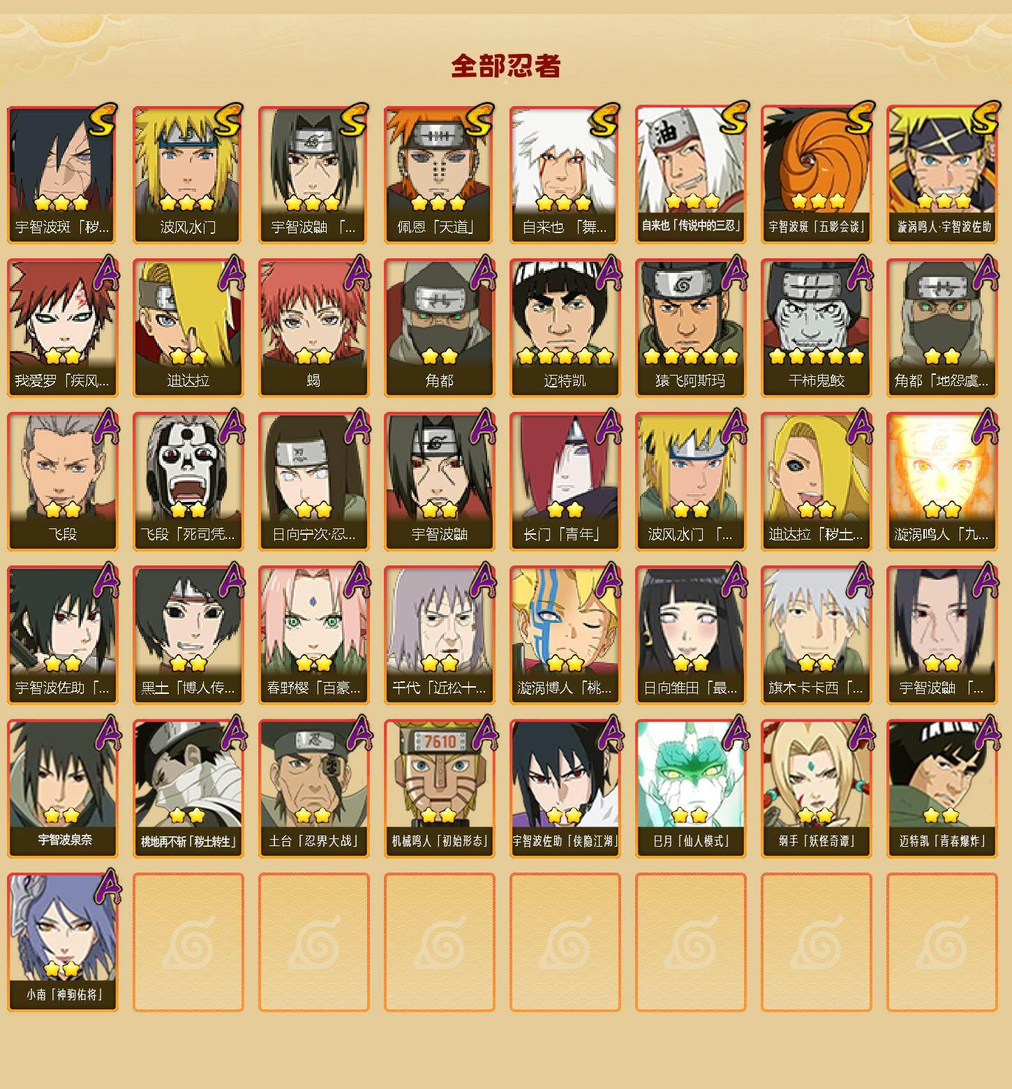 【S级忍者】:宇智波斑「秽土转生·解」(3星),宇智波鼬「须佐能乎」(3星),自来也「舞之豪杰」(3星),自来也「传说中的三忍」(3星),波风水门(3星),佩恩「天道」(3星),宇智波斑「五影会谈」(3星),漩涡鸣人·宇智波佐助(3星)