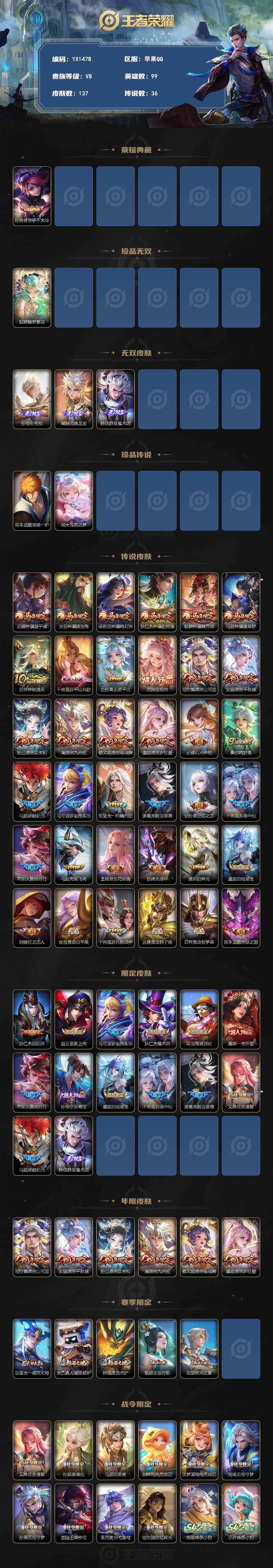 苹果Q-V8-137皮肤1典藏1珍品无双3无双2珍品传说36传说/馥梦繁花杀手不太冷/无相/器灵螭龙剑/群星魔术团/黑崎一护/大耳狗之梦