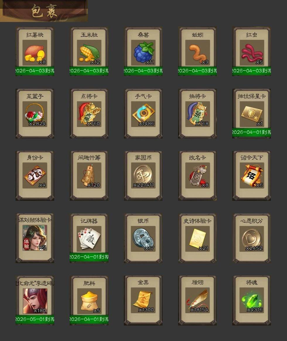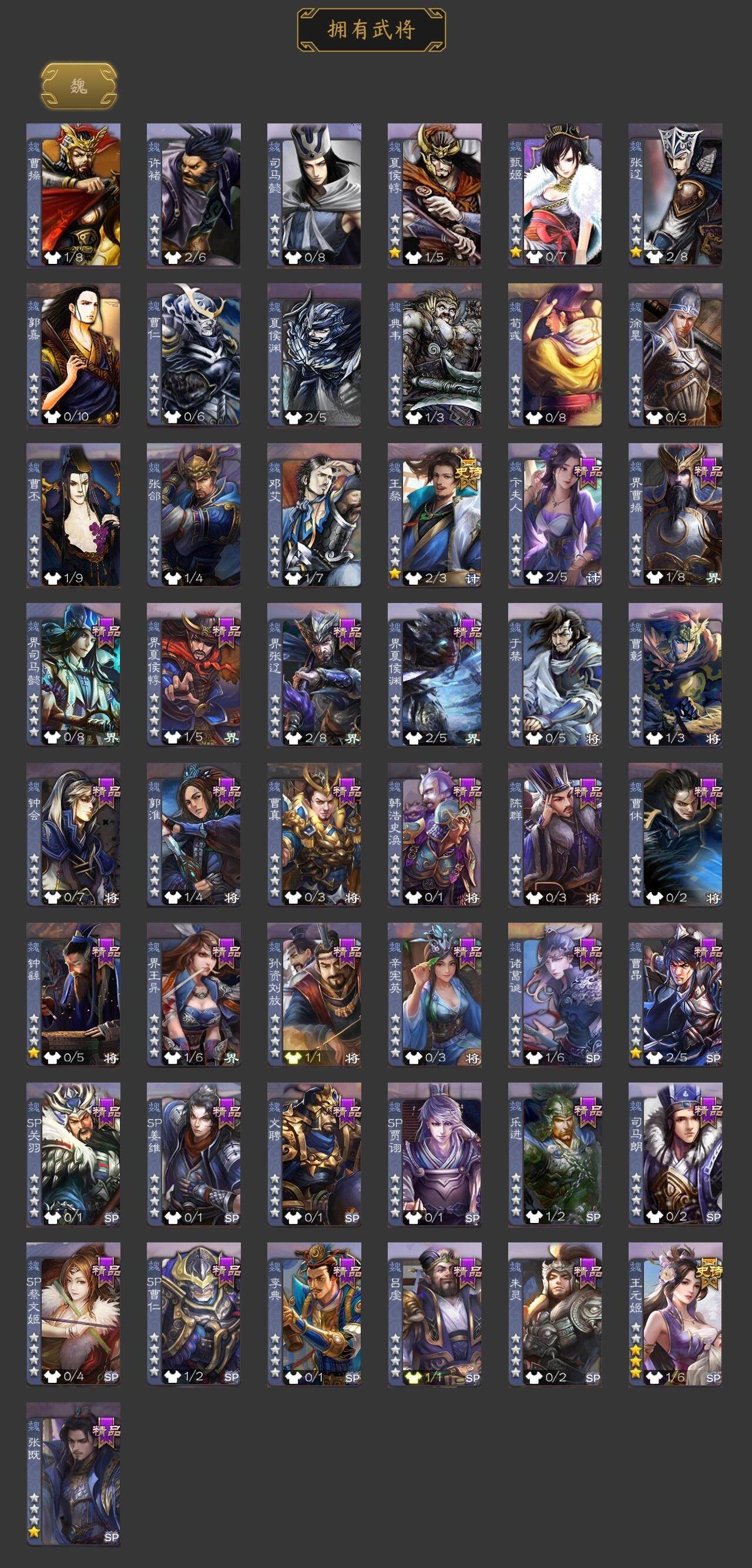 神刘备,王粲,王元姬,马云騄,谋夏侯氏,花鬘,界徐盛,星黄忠,友诸葛亮,SP关羽,SP曹仁,SP蔡文姬,乐进,曹昂,诸葛诞,朱灵,文聘,SP姜维,钟会,郭淮,界王异,界曹操,界司马懿,界夏