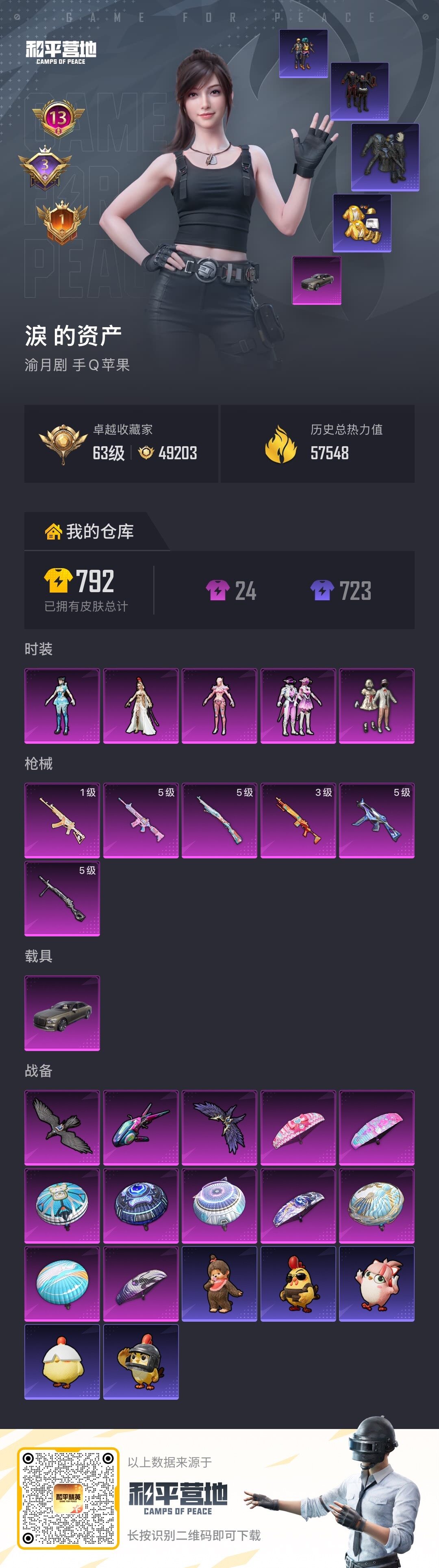 苹果 手Q-5粉装-6特效枪-1载具-3粉色飞行器-57548热力值-13王牌印记-154套装-205枪皮
