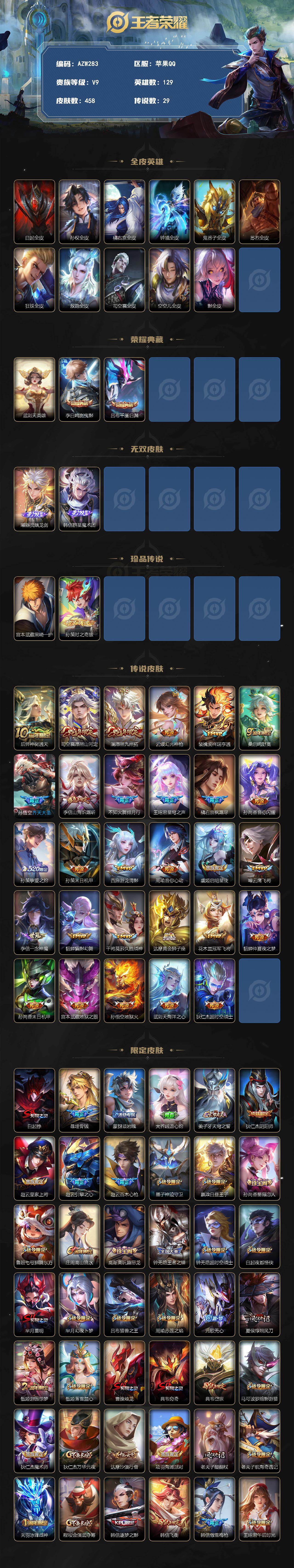 【AZW283】苹果Q-V9-最强王者段位-129英雄-458皮肤-2典藏皮肤-1典藏英雄-2无双-2珍品传说-29传说-135史诗