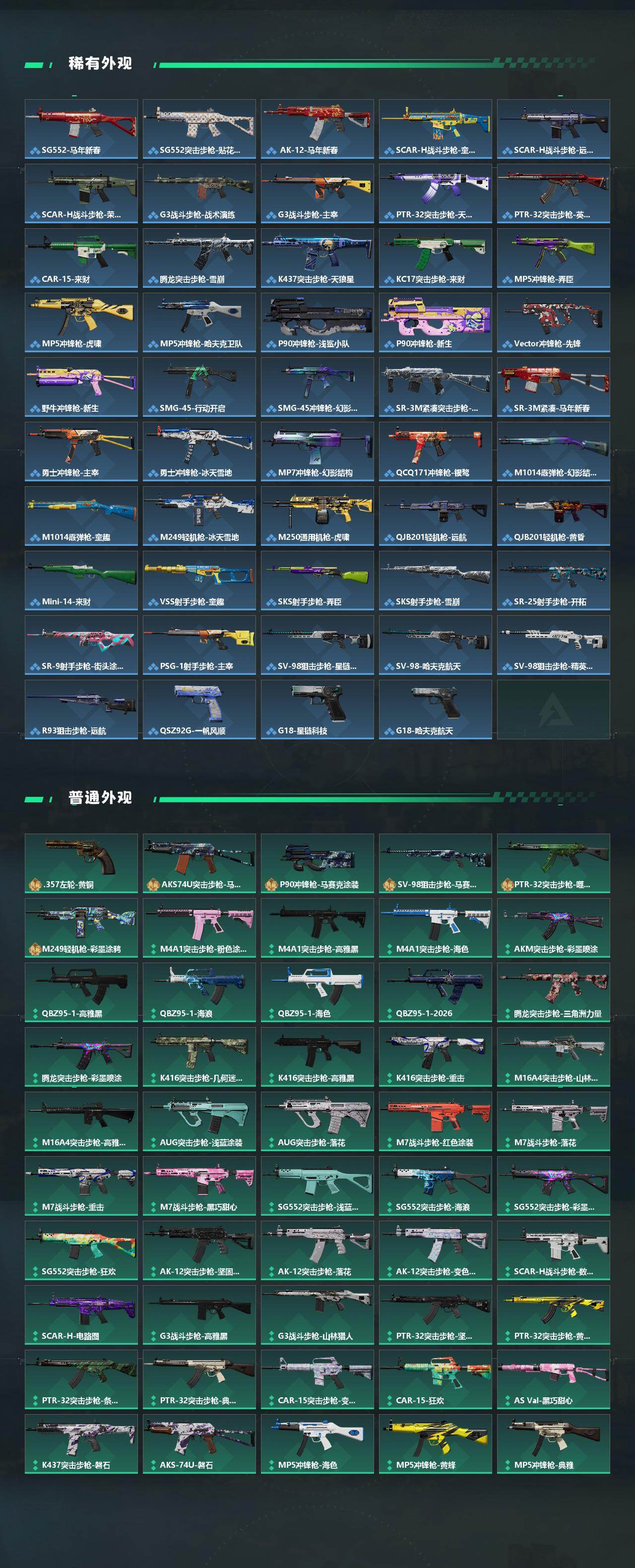 【传说外观】:M4A1突击步枪-阿米娅,AUG突击步枪-悠然茶歇,SG552突击步枪-运动员,AK-12突击步枪-夜鹰,AK-12突击步枪-特斯拉线圈,SCAR-H战斗步枪-水墨云图,SCAR-H战斗步枪-启航,SCAR-H战斗步枪-荼蘼,腾龙突击步枪-捞点薯条,腾龙突击步枪-万金泪冠,MK47突击