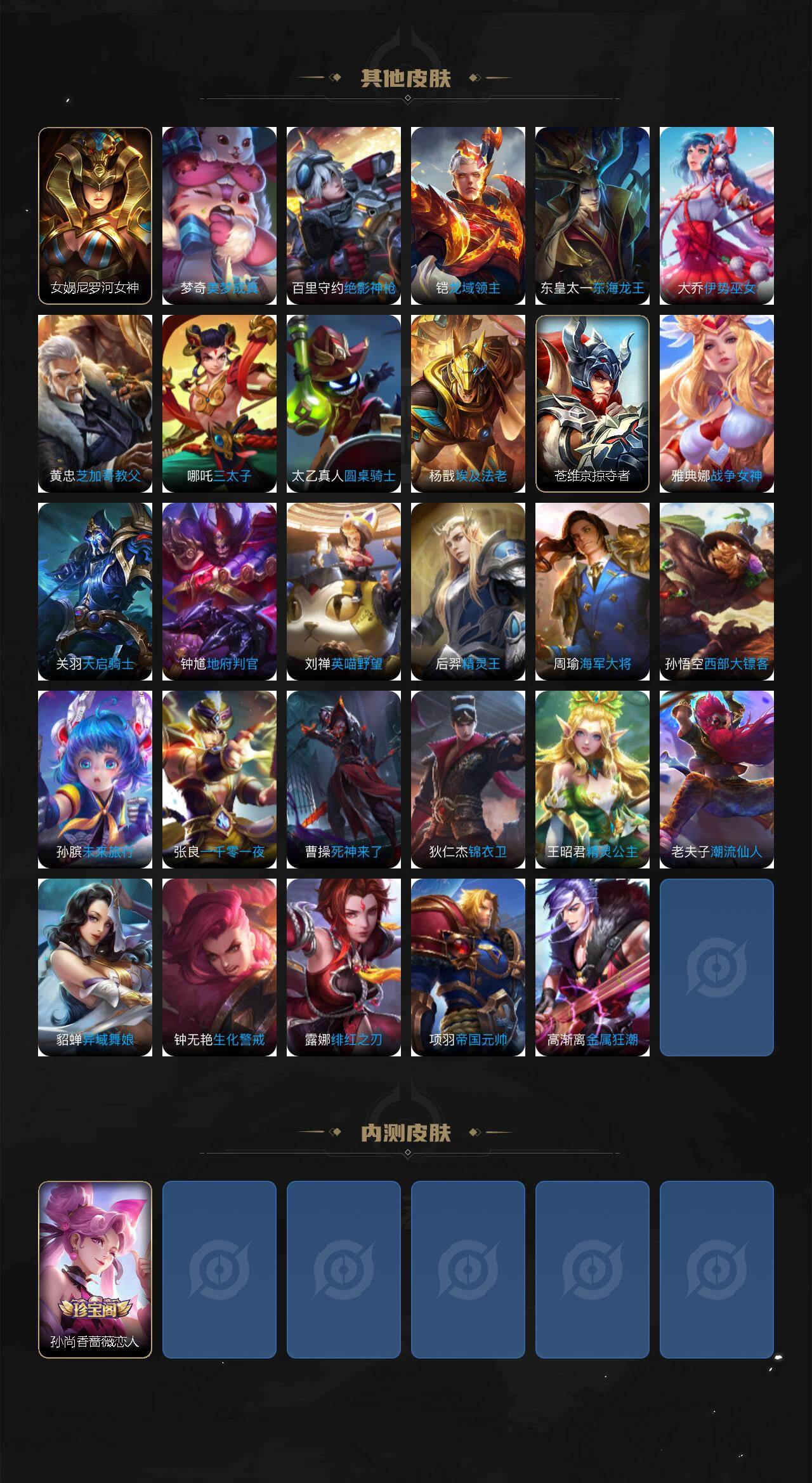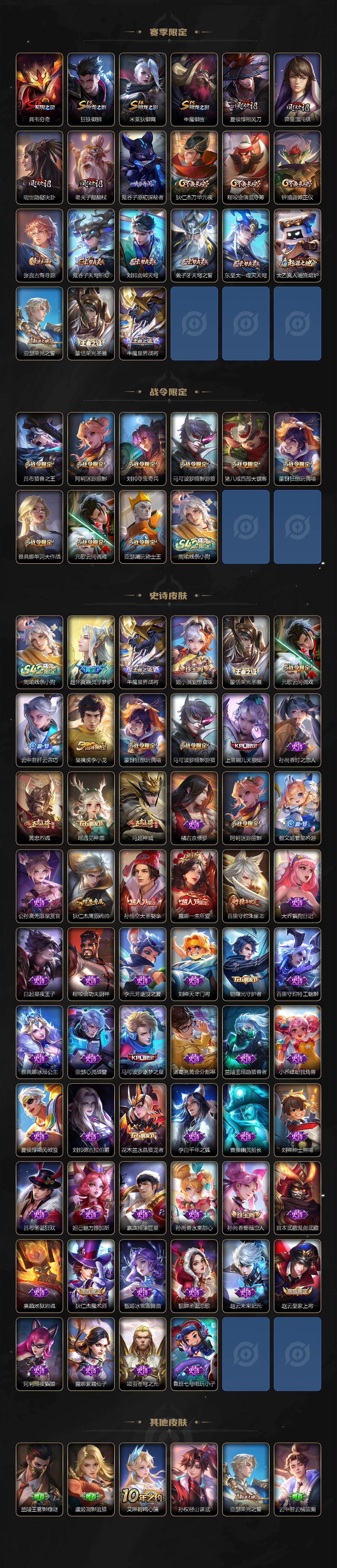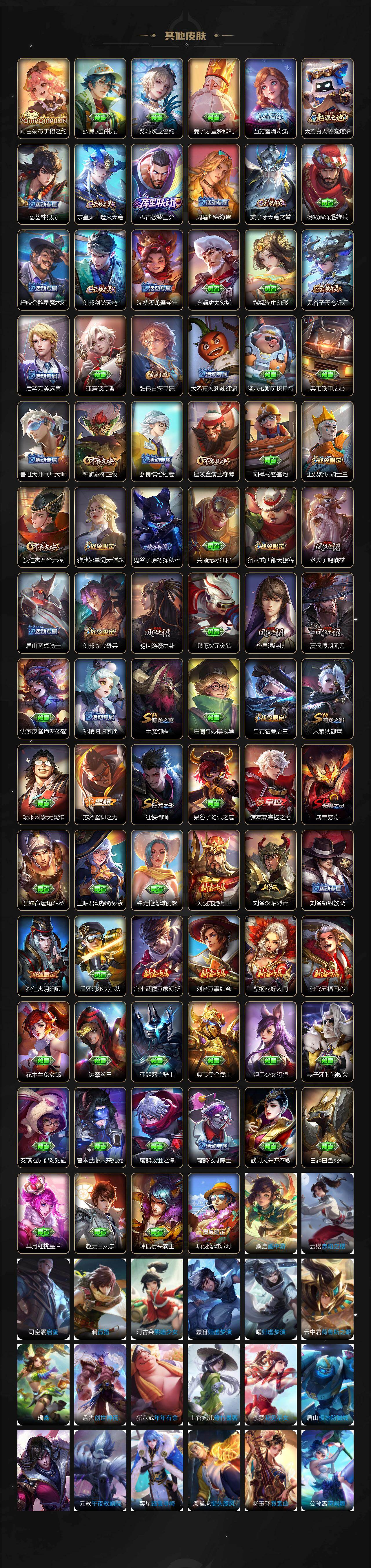 【传说皮肤】:后羿神树通天,云缨幻光神枪,桑启鸣野蒿,西施游龙清影,李元芳飞鸢探春,虞姬启明星使,孙悟空零号赤焰,关羽武圣,曜云鹰飞将,李信一念神魔,干将莫邪久胜战神,虞姬云霓雀翎,达摩黄金狮子座,百里玄策白虎志,宫本武藏地狱之眼,孙悟空地狱火,狄仁杰超时空战士
