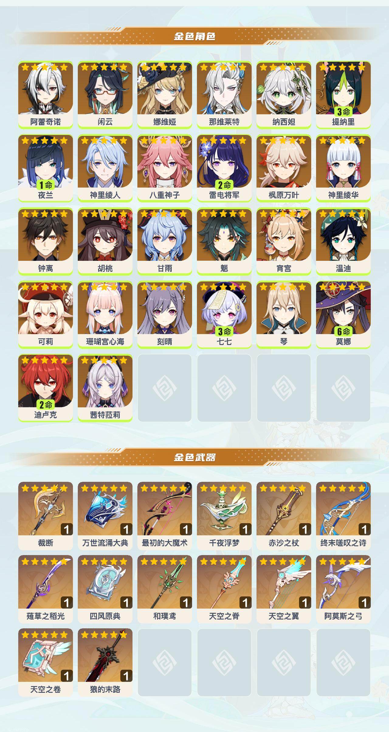 【YSX1859】60级/57黄/女主/26个五星角色/14个五星武器/那维莱特/阿蕾奇诺/枫原万叶/魈/神里绫华/八重神子/2命雷电将军/纳西妲/3命提纳里/1命夜兰/宵宫/胡桃/可莉/2命迪卢克/茜特菈莉/娜维娅/钟离/闲云/温迪/琴/甘雨/3命七七/刻晴/神里绫人/珊瑚宫心海/满命莫娜/最初的大魔术/终末嗟叹之诗/阿莫斯之弓/天空之翼/万世流涌大典/千夜浮梦/四风原典/天空之卷/赤沙之杖/薙草之稻光/和璞鸢/天空之脊/裁断/狼的末路