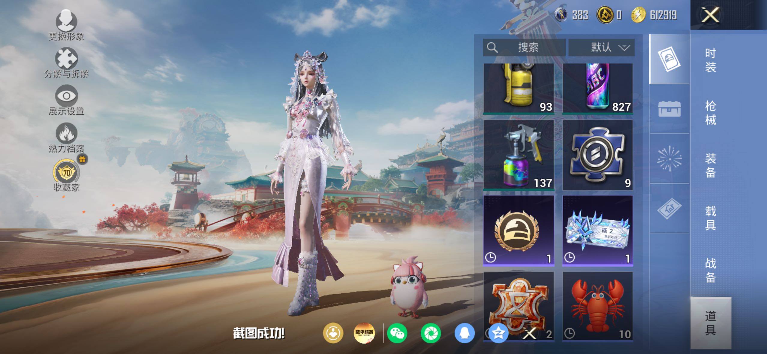 苹果 手Q-3粉装-9特效枪-0载具-1粉色飞行器-85996热力值-20王牌印记-192套装-287枪皮