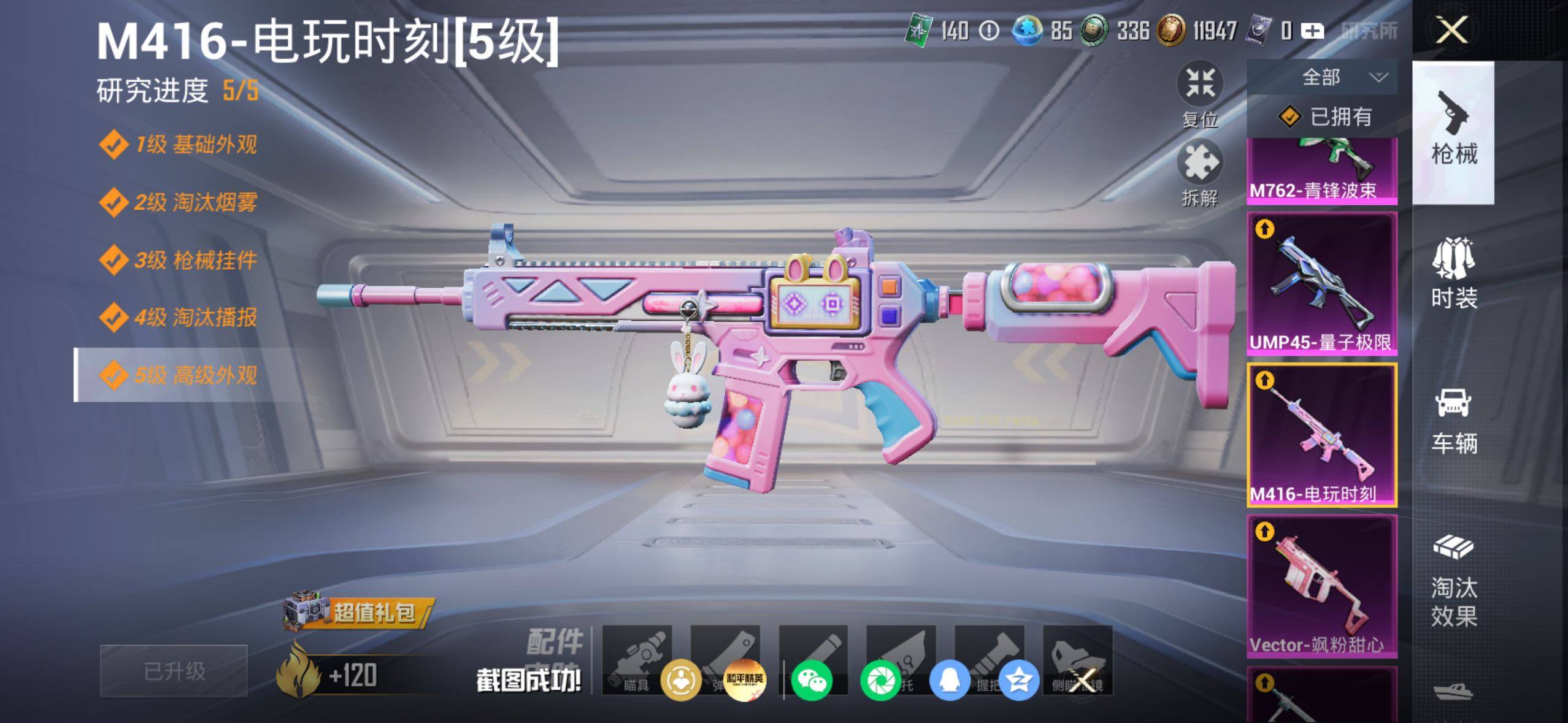 【粉色枪皮等级】:M416-电玩时刻(五级),GROZA-镜光银凌(五级),M762-青锋波束(五级),UMP45-量子极限(五级),Vector