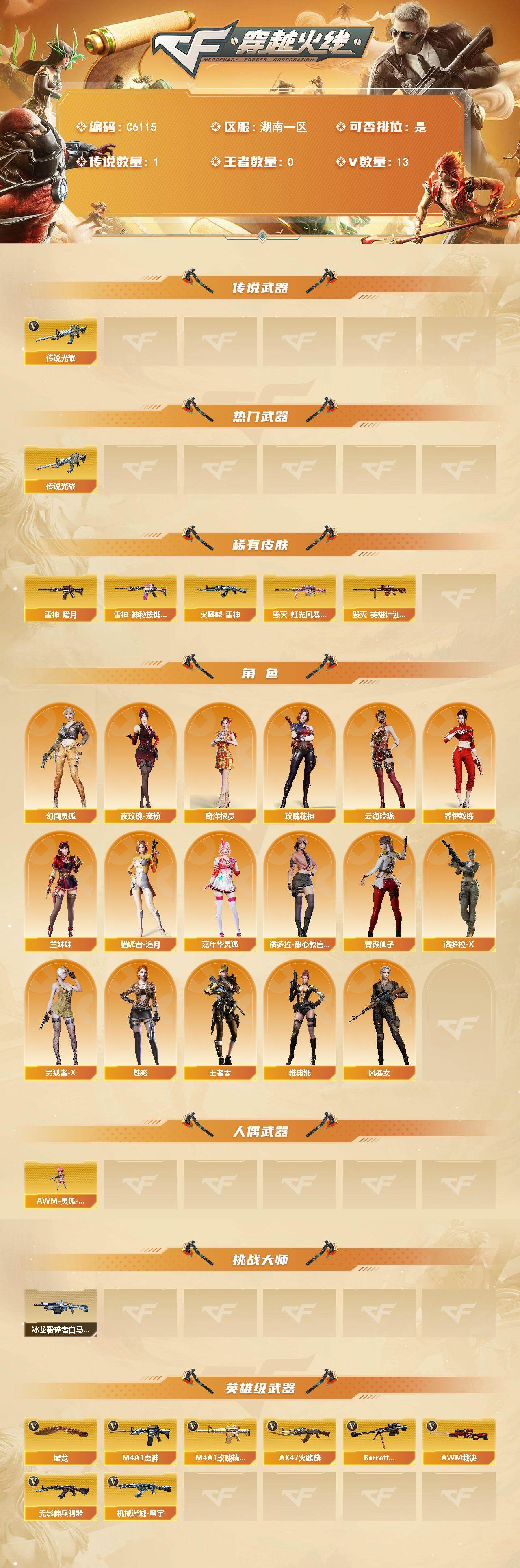 【C6115】湖南一区-15V-0王者武器数-0炫金武器数