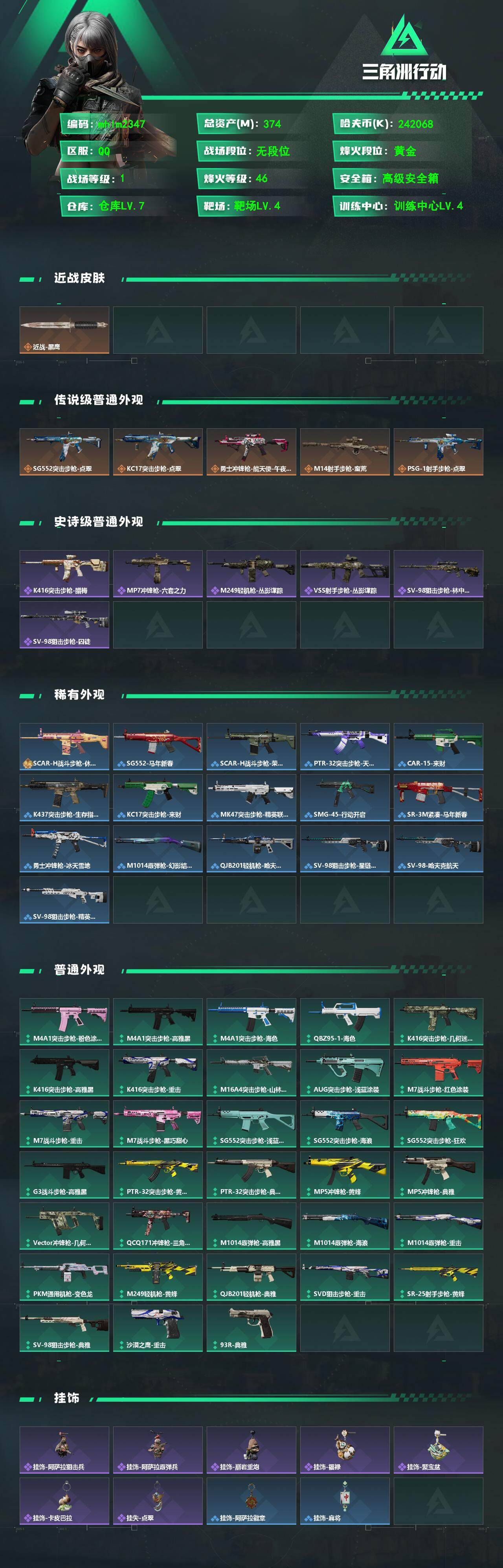 374m总资产-242068k哈夫币-46烽火等级-黄金-1战场等级-无军衔