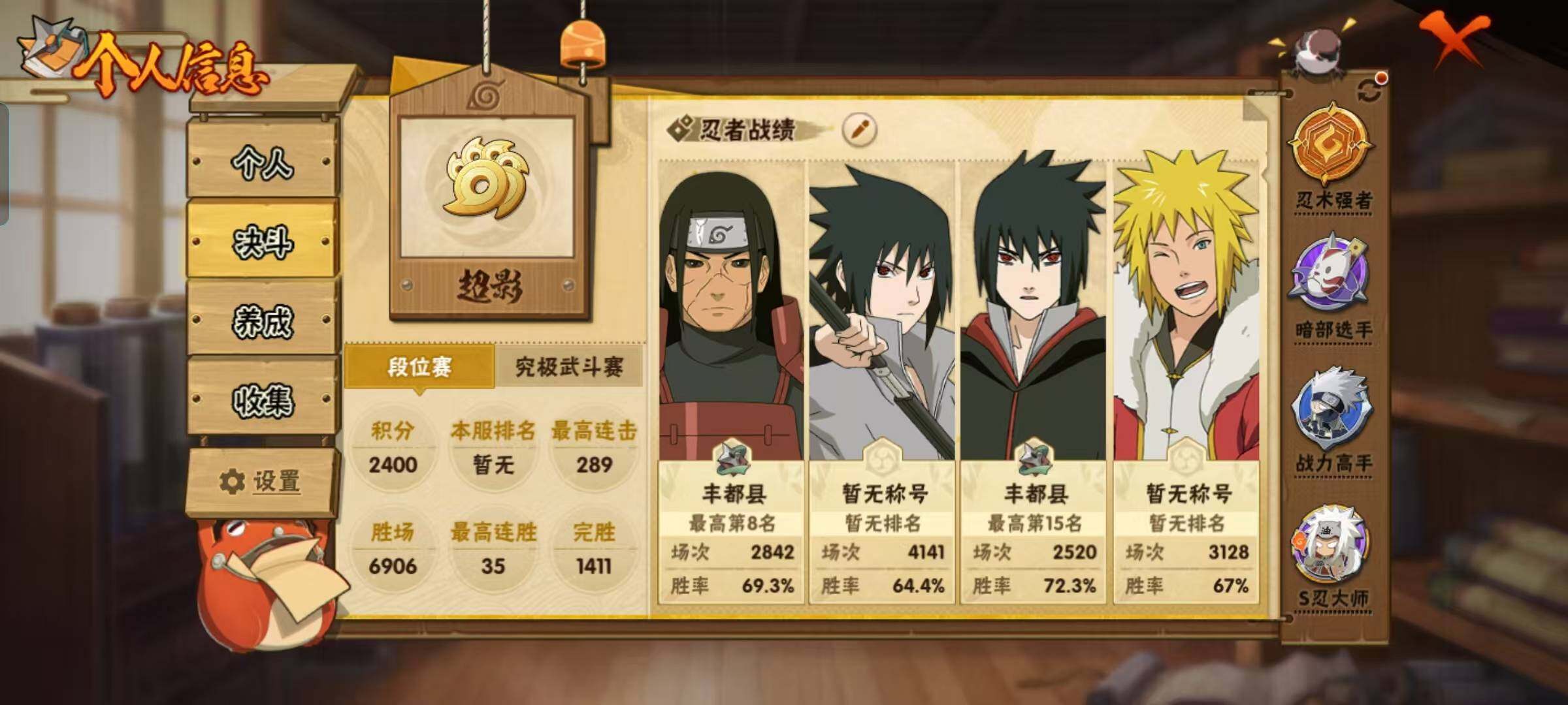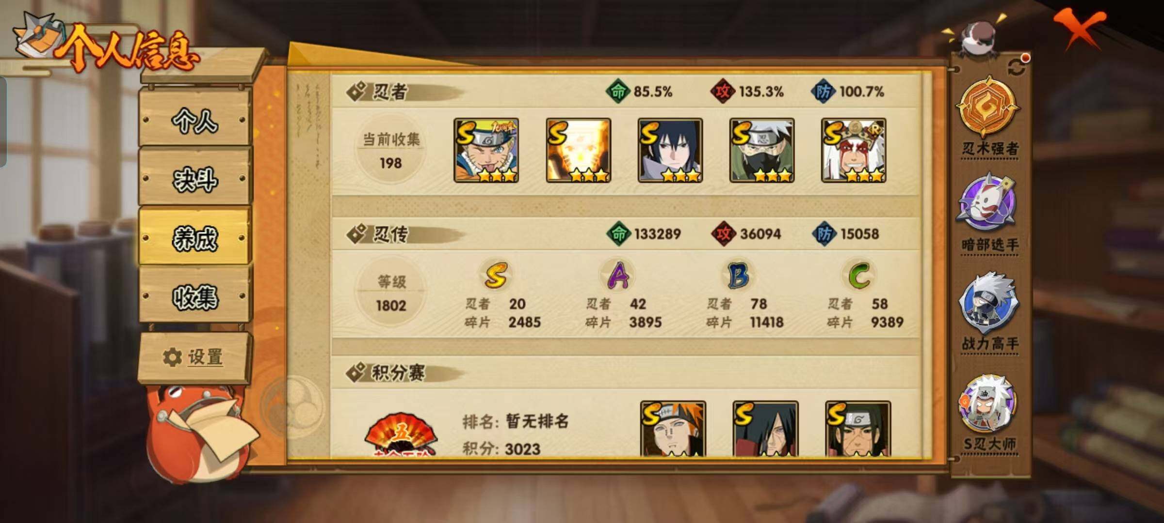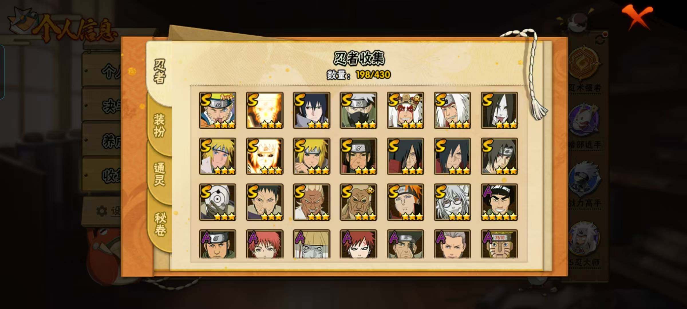 【S级忍者】:波风水门「秽土转生」(3星),千手柱间「秽土转生」(3星),宇智波斑「秽土转生」(3星),宇智波斑「秽土转生·解」(3星),宇智波带土「忍界大战」(3星),艾「忍界大战」(3星),宇智波鼬「须佐能乎」(3星),旗木卡卡西「须佐能乎」(3星),艾「三代目雷影」(3星),自来也「舞之豪杰」(3星),大蛇丸(3星),自来也「传说中的三忍」(3星),波风水门(3星),药师兜「仙人模式」(3星),漩涡鸣人「九喇嘛连结」(3星),佩恩「天道」(3星),宇智波佐助