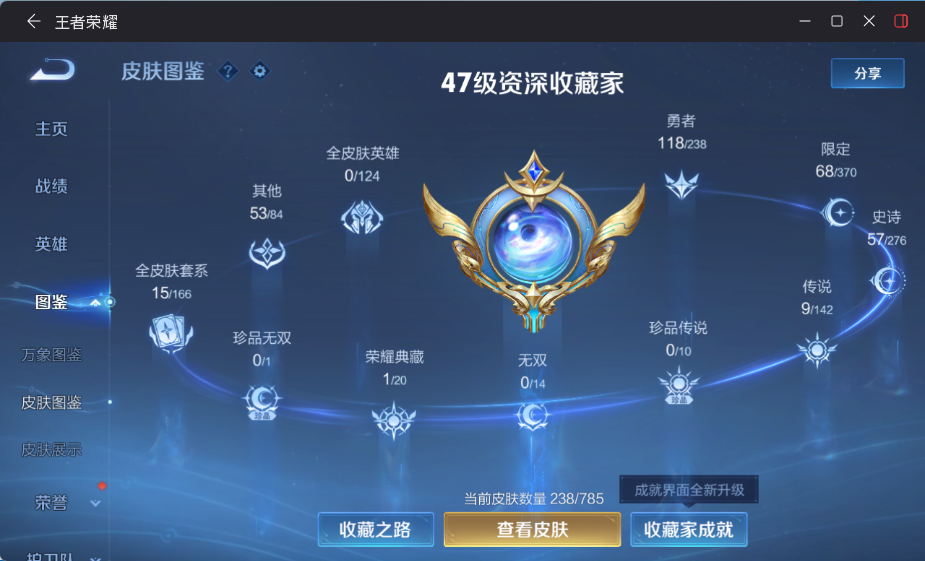 神奇女侠!尚香典藏!皮肤数量238印记总数16V7最强王者暂
