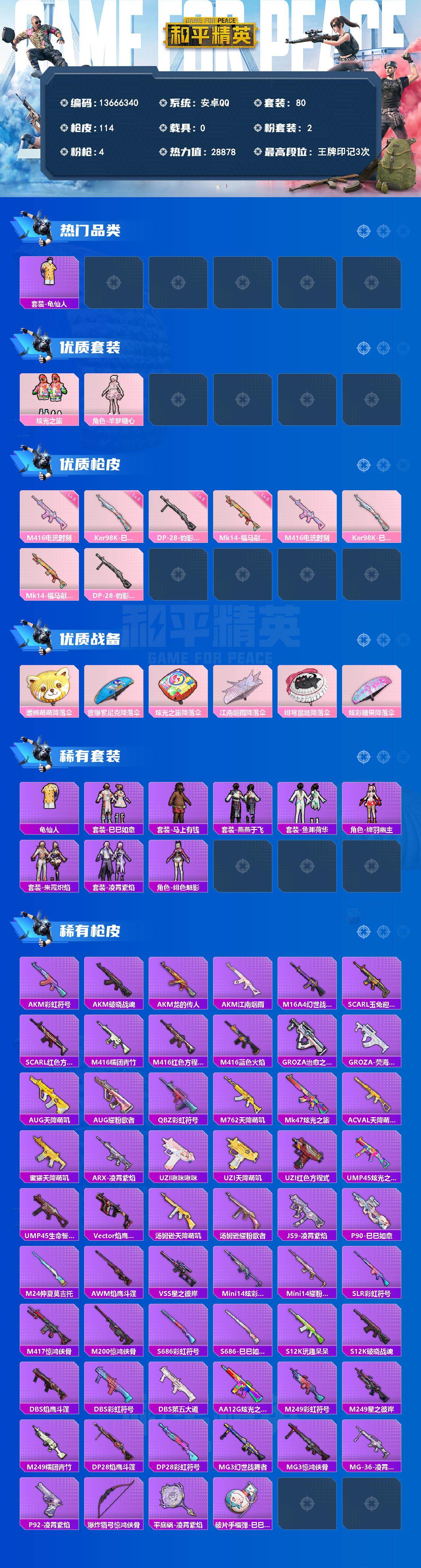 80套装/枪械4/装备115/战备66/王牌印记3/热力值28878/五级M416-电玩时刻/五级Kar98K-巳巳如意/五级Mk14-福马献瑞/五级DP-28-豹影疾电/套装-龟仙人/炫光之旅/角色-羊梦糖心/M416-电玩时刻/Kar98K-巳巳如意/Mk14-福马献瑞/DP-28-豹影疾电/暖熊萌萌降落伞/音爆索尼克降落伞/炫光之旅降落伞/江南烟雨降落伞/绯穹魔姬降落伞/炫彩糖果降落伞/龟