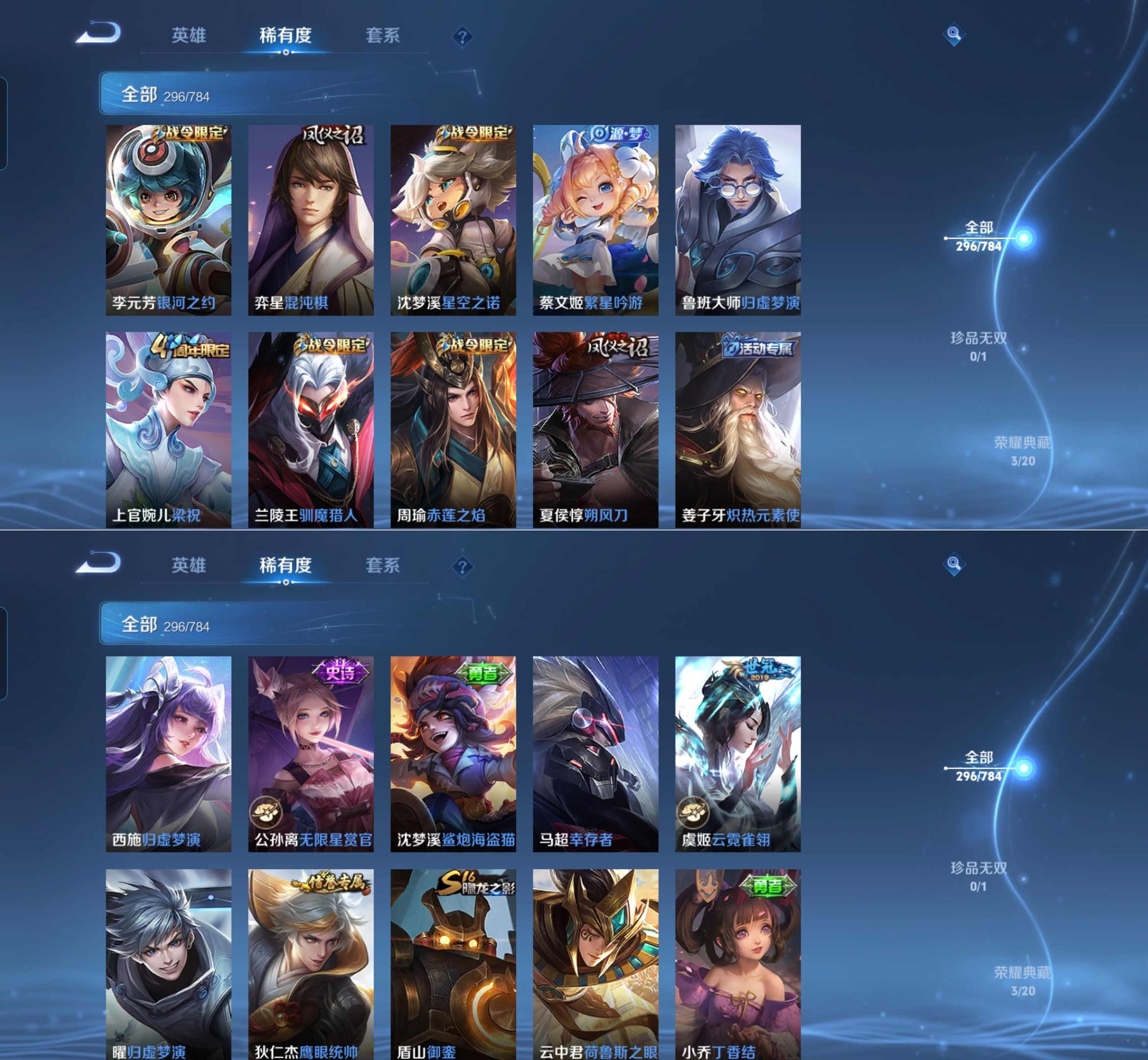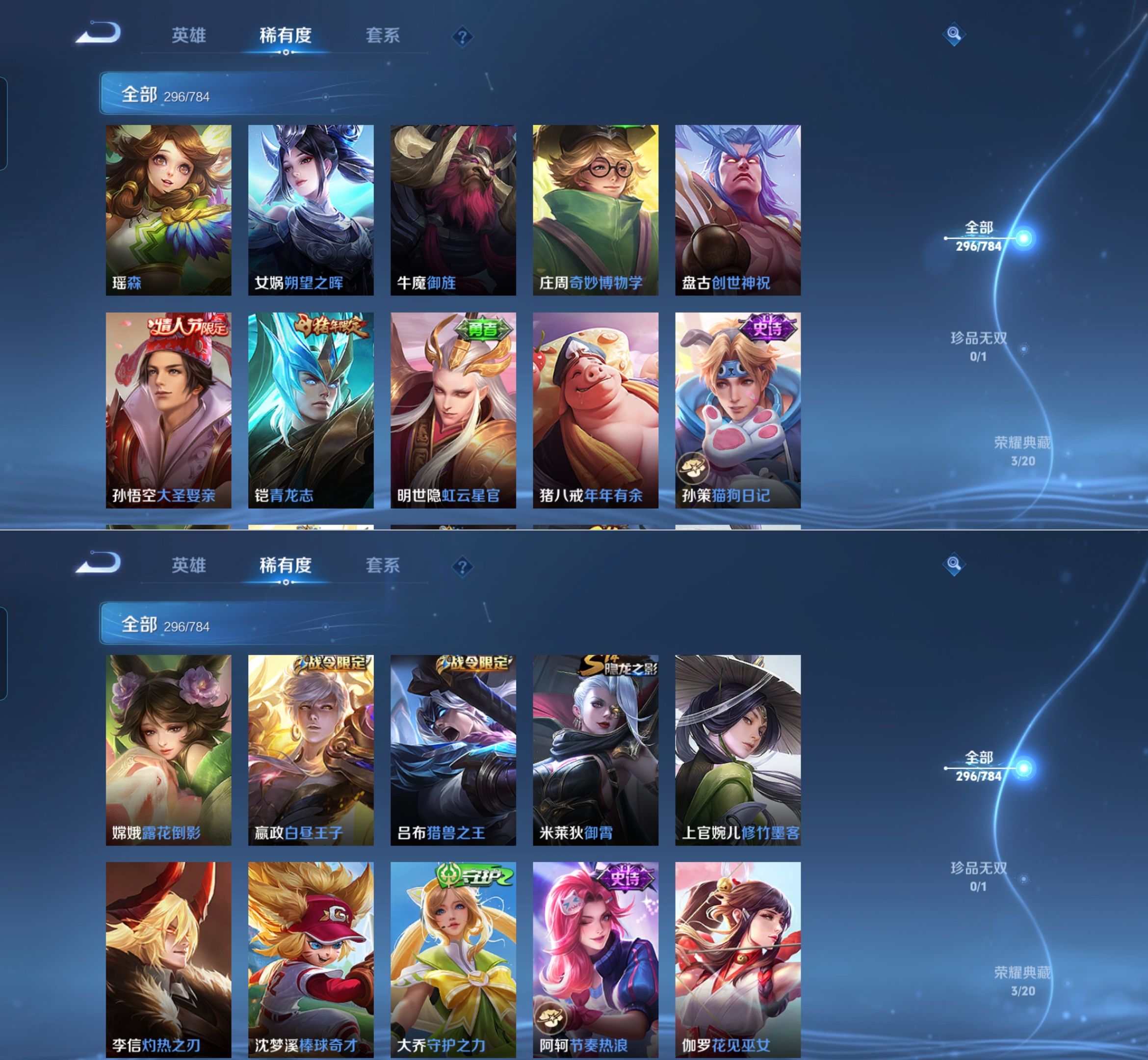 【传说皮肤】 星之鸣奏 鸣野蒿 逐花归海 琥珀纪元 战鼓燎原 祥瑞亨通 愿照·九州拓 超时空战士 太华 地狱之眼 永曜之星 云鹰飞将 云霓雀翎 启明星使 淬星耀世