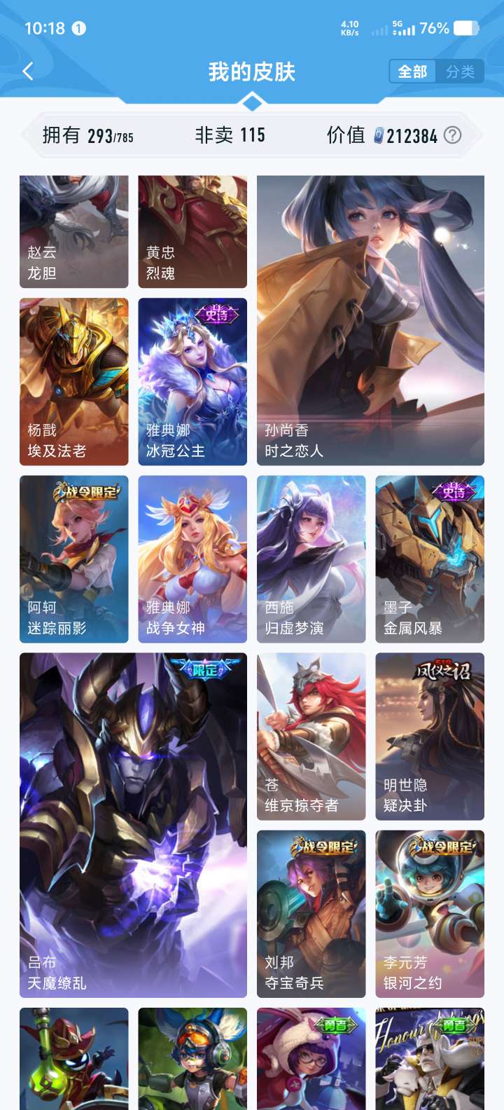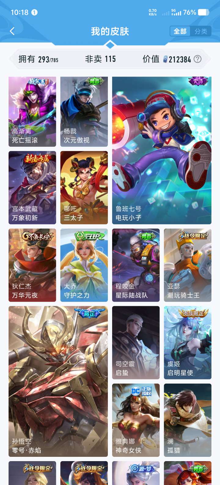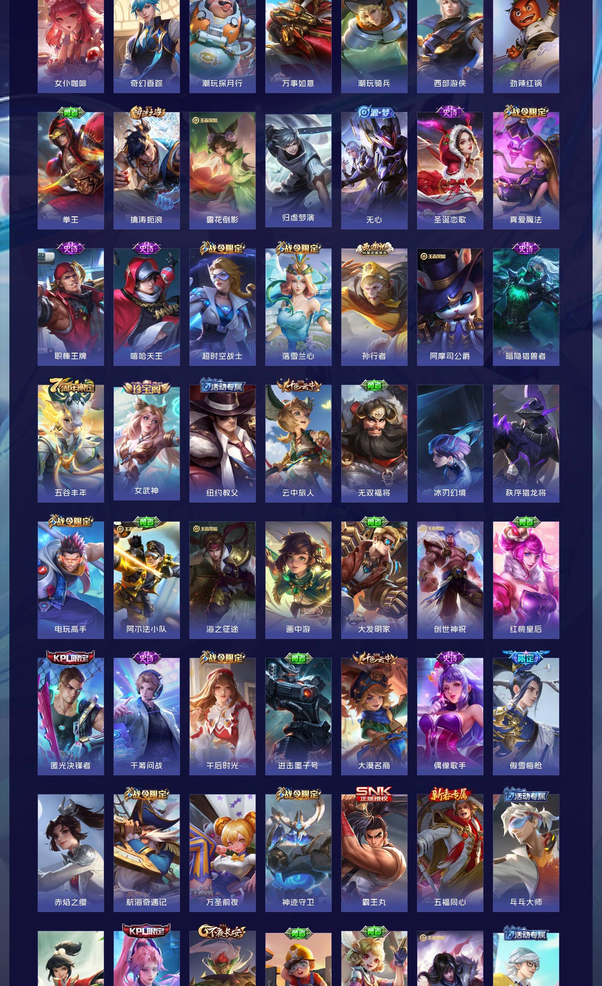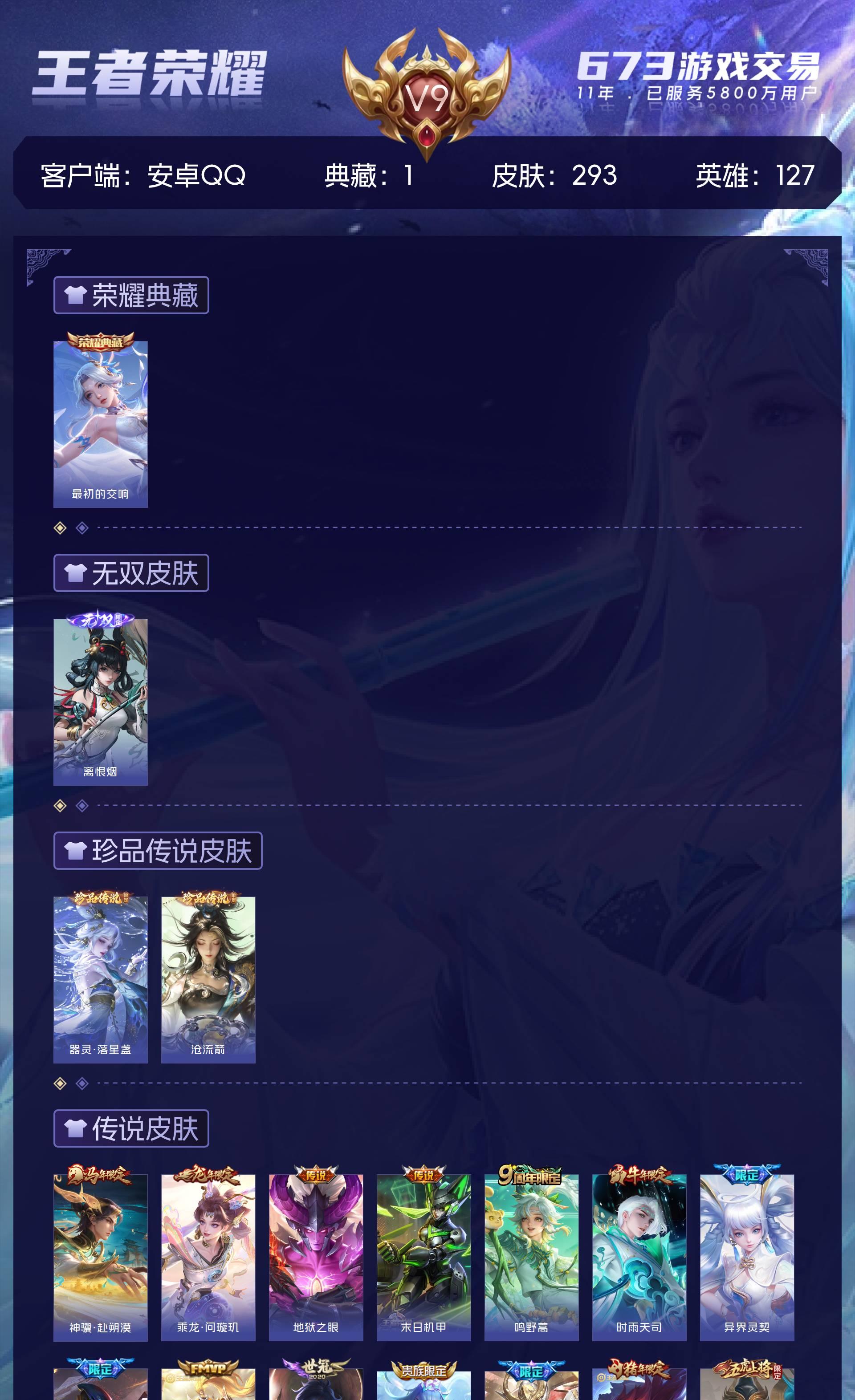 V9 皮肤293 英雄127 绝世王者 荣耀典藏1 无双皮肤1 珍品传说2 传说20