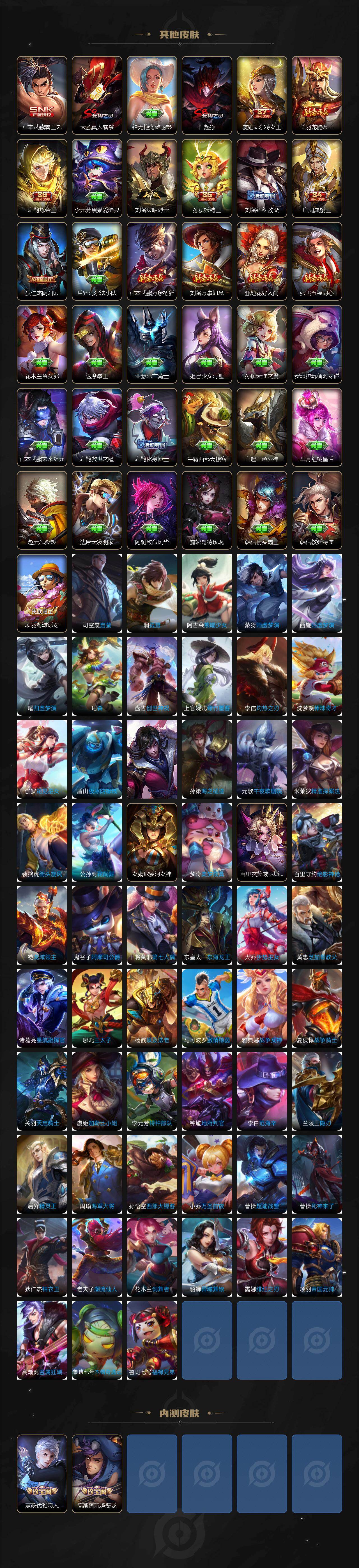 【限定皮肤】:白起狰,姜子牙天穹之誓,狄仁杰阴阳师,虞姬凯尔特女王,赵云皇家上将,嬴政优雅恋人,庄周蜃楼王,高渐离玩趣恶龙,孙膑妖精王,扁鹊炼金王,芈月重明,夏侯惇朔风刀,甄姬游园惊梦