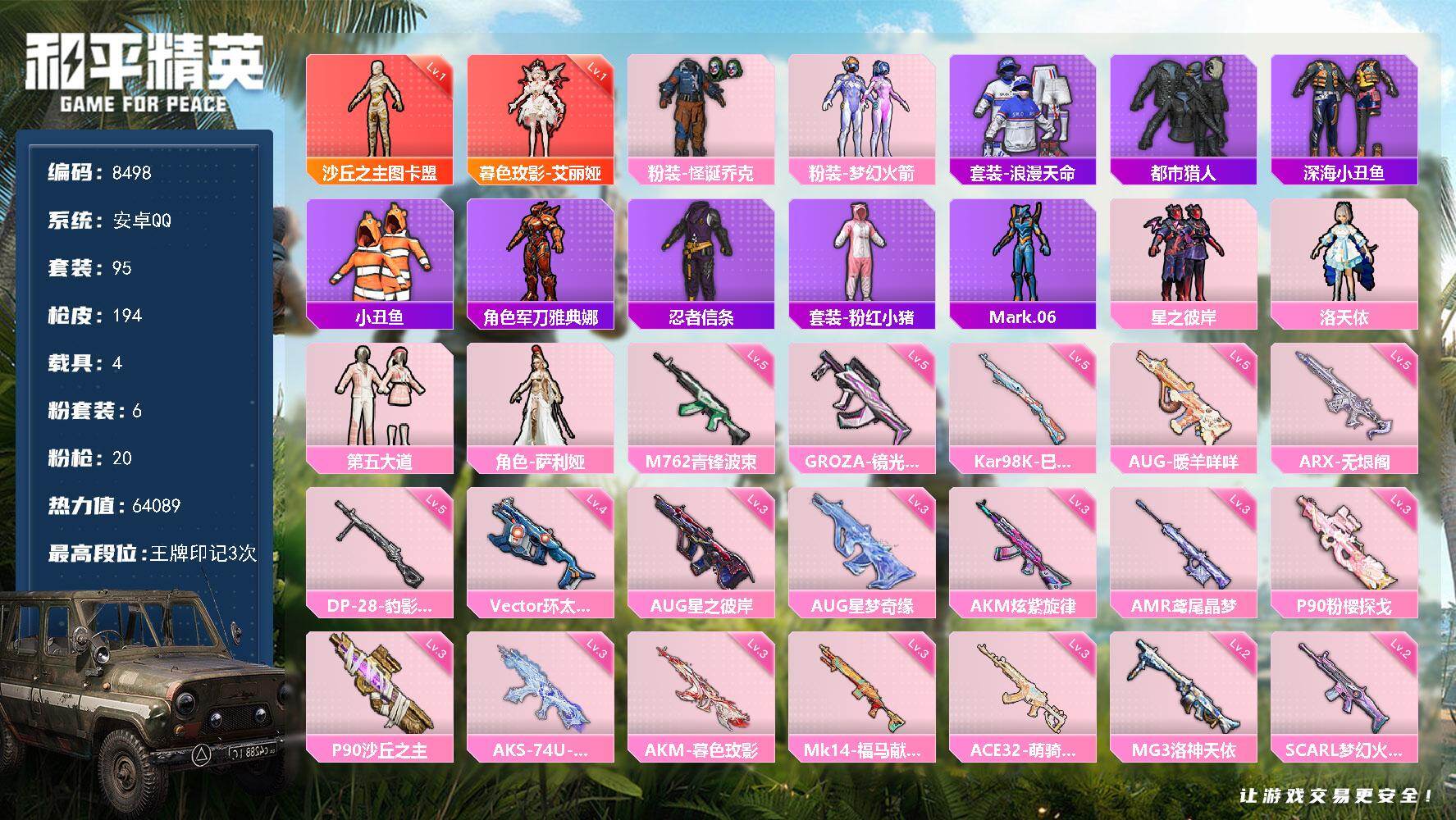 【8498】2神装-6粉装-20特效枪-4载具-12粉色飞行器-64089热力值-3王牌印记-95套装-194枪皮