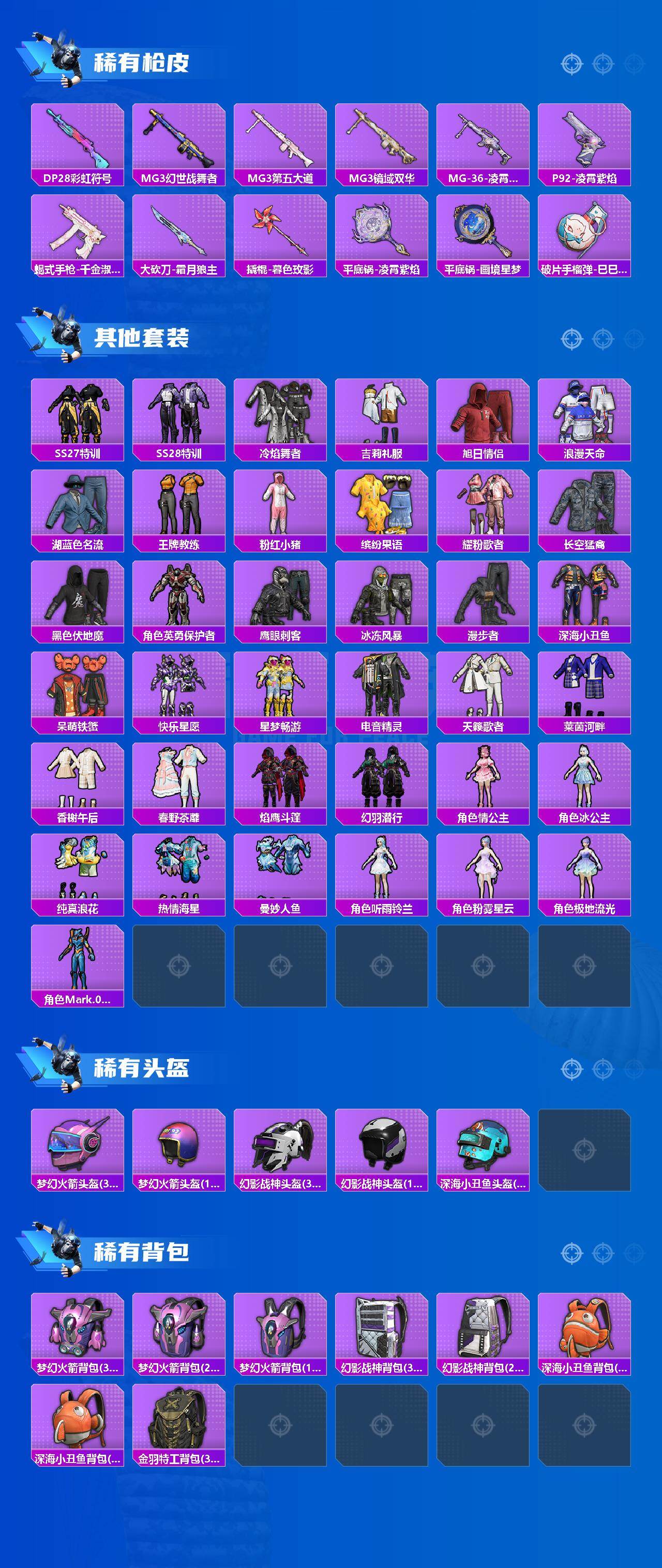 【热门品类】:粉装-怪诞乔克,粉装-梦幻火箭,套装-浪漫天命,套装-都市猎人,套装-深海小丑鱼,套装-小丑鱼,角色-军刀雅典娜,套装-忍者信条,套装-粉红小猪,角色-Mark.06