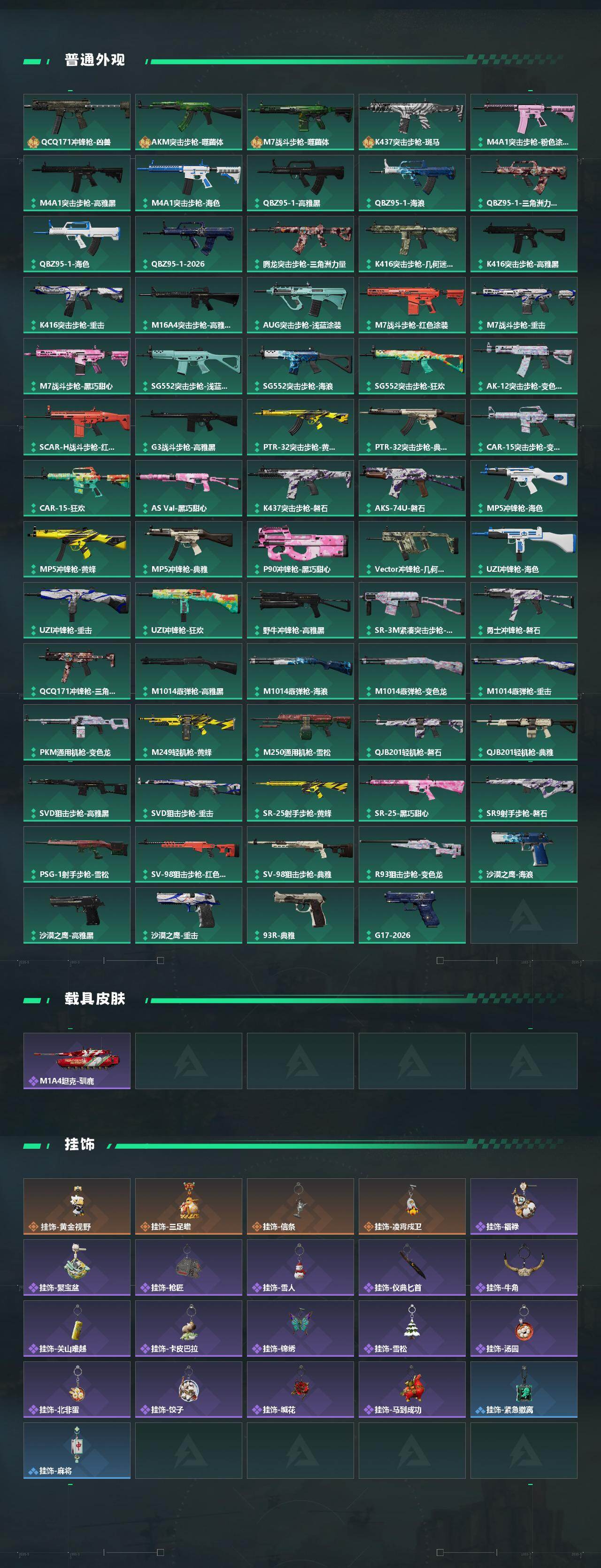 【传说外观】:AKM突击步枪-锦绣,K416突击步枪-行动记录,SG552突击步枪-运动员,腾龙突击步枪-马年祥瑞,K437突击步枪-锦绣,P90冲锋枪-信条,SMG-45冲锋枪-