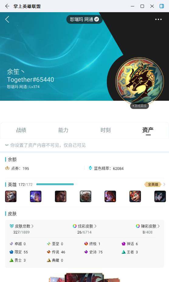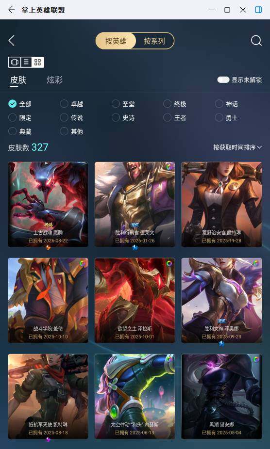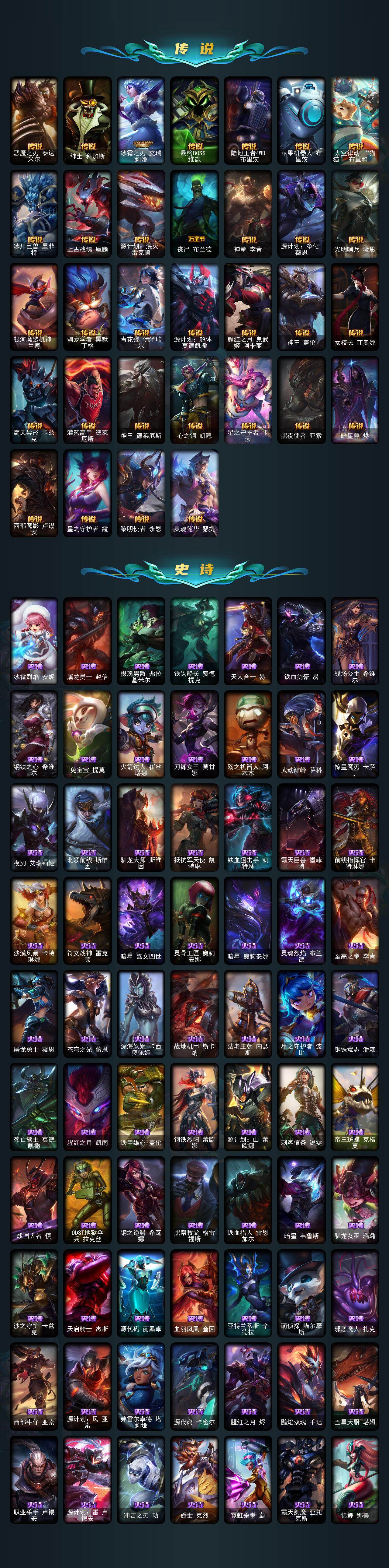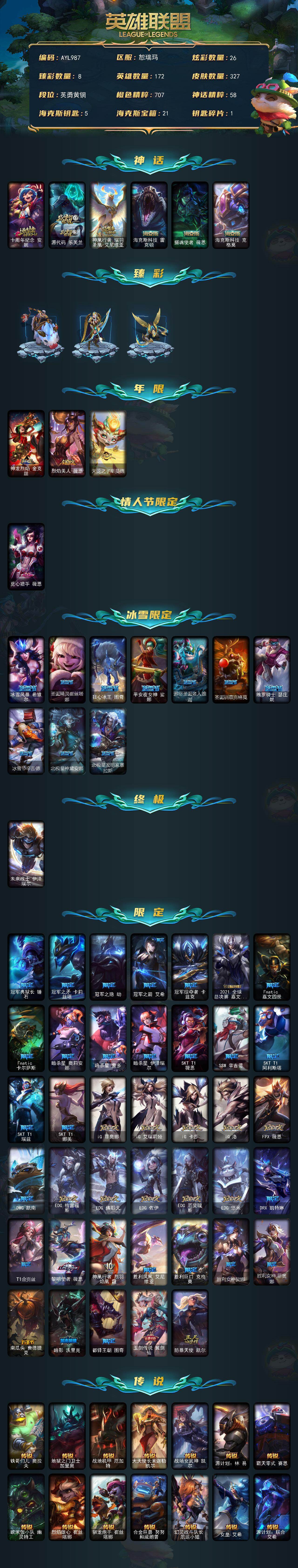 青铜段位-172英雄-327皮肤-26炫彩-1终极-6神话-55限定-46传说-75史诗