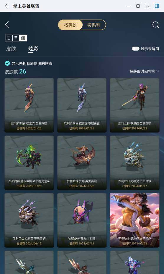【臻彩皮肤】:无畏骑士瑟庄妮赤子初心,冠军之箭艾希凯旋圣装,冠军掠夺者卡兹克凯旋圣装