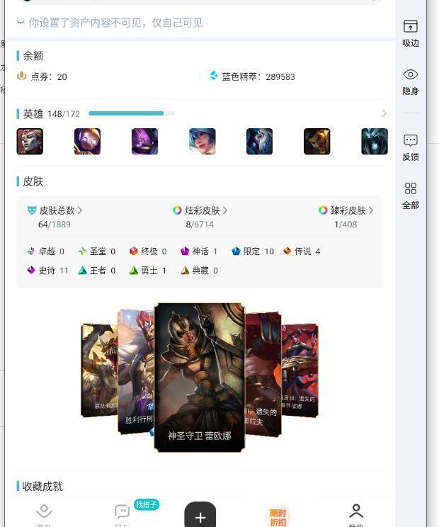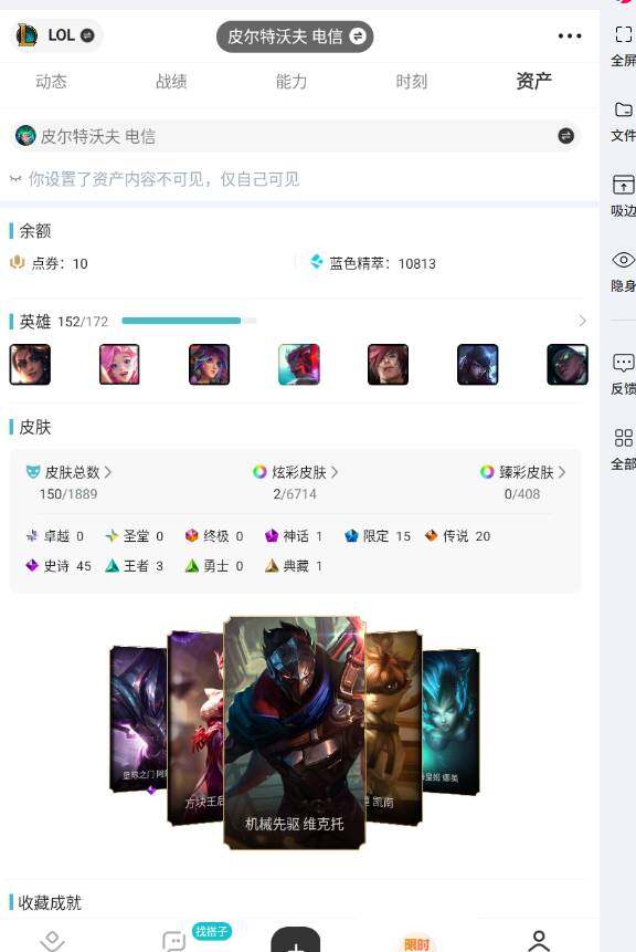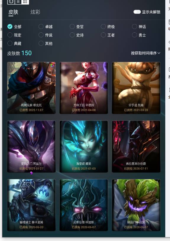 未定级段位-152英雄-150皮肤-2炫彩-0终极-1神话-15限定-20传说