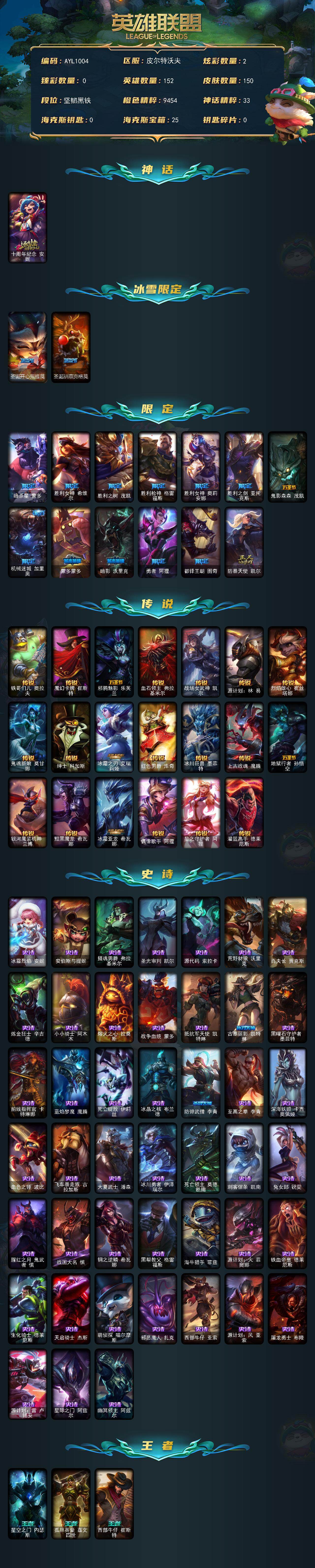未定级段位-152英雄-150皮肤-2炫彩-0终极-1神话-15限定-20传说-45史诗