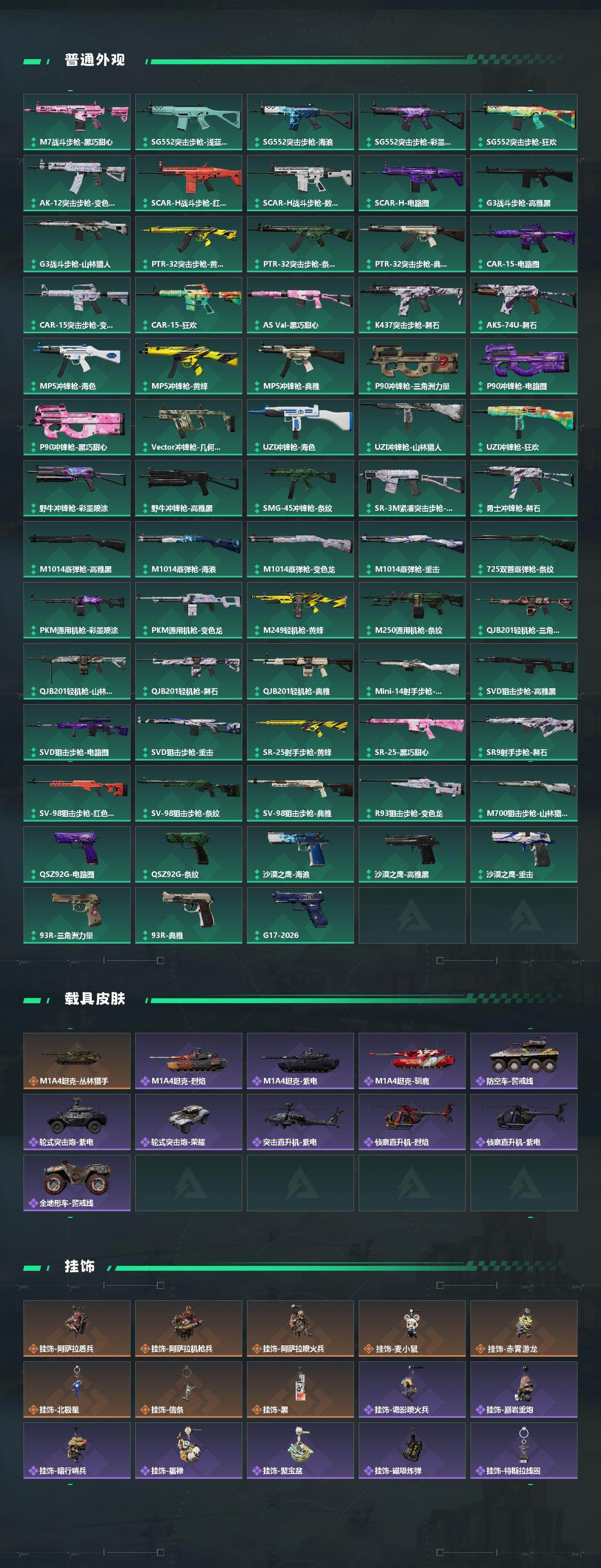 【传说外观】:M4A1突击步枪-阿米娅,AKM突击步枪-锦绣,ASh-12战斗步枪-鹅鸭杀,K416突击步枪-行动记录,M16A4突击步枪-狩猎时刻,AUG突击步枪-悠然茶歇,SG552突击步枪-运动员,AK-12突击步枪-特斯拉线圈,SCAR-H