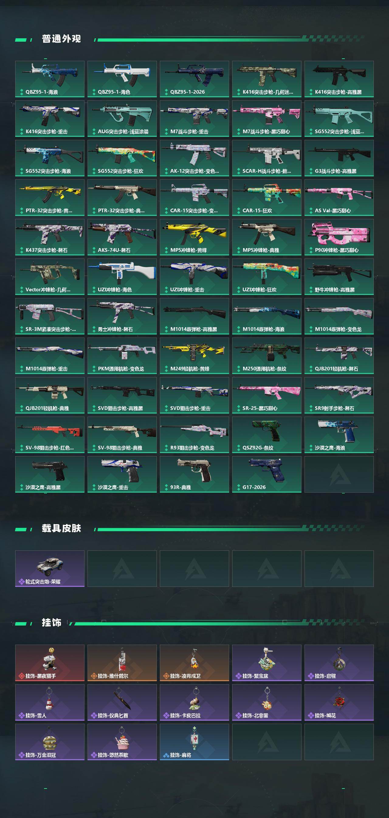 【传说外观】:QBZ95-1突击步枪-凌霄戍卫,AUG突击步枪-悠然茶歇,SG552突击步枪-运动员,SCAR-H战斗步枪-启航,腾龙突击步枪-万金泪冠,KC17突击步枪-电锯惊魂,MK47突击步枪-悠然茶歇,UZI冲锋枪-悠然茶歇,勇士冲