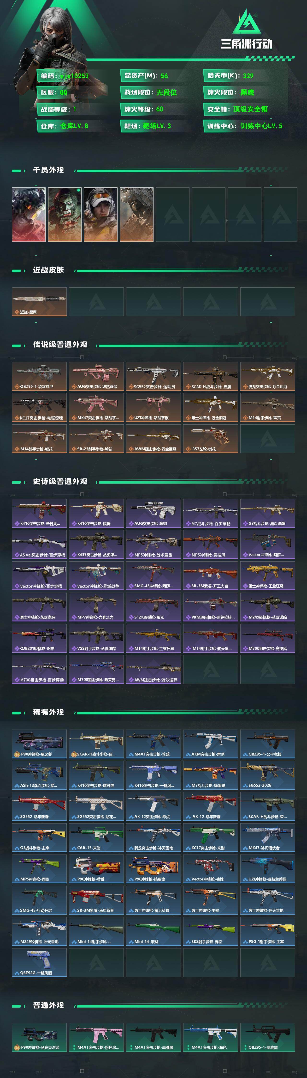 56m总资产-329k哈夫币-60烽火等级-黑鹰-1战场等级-无军衔