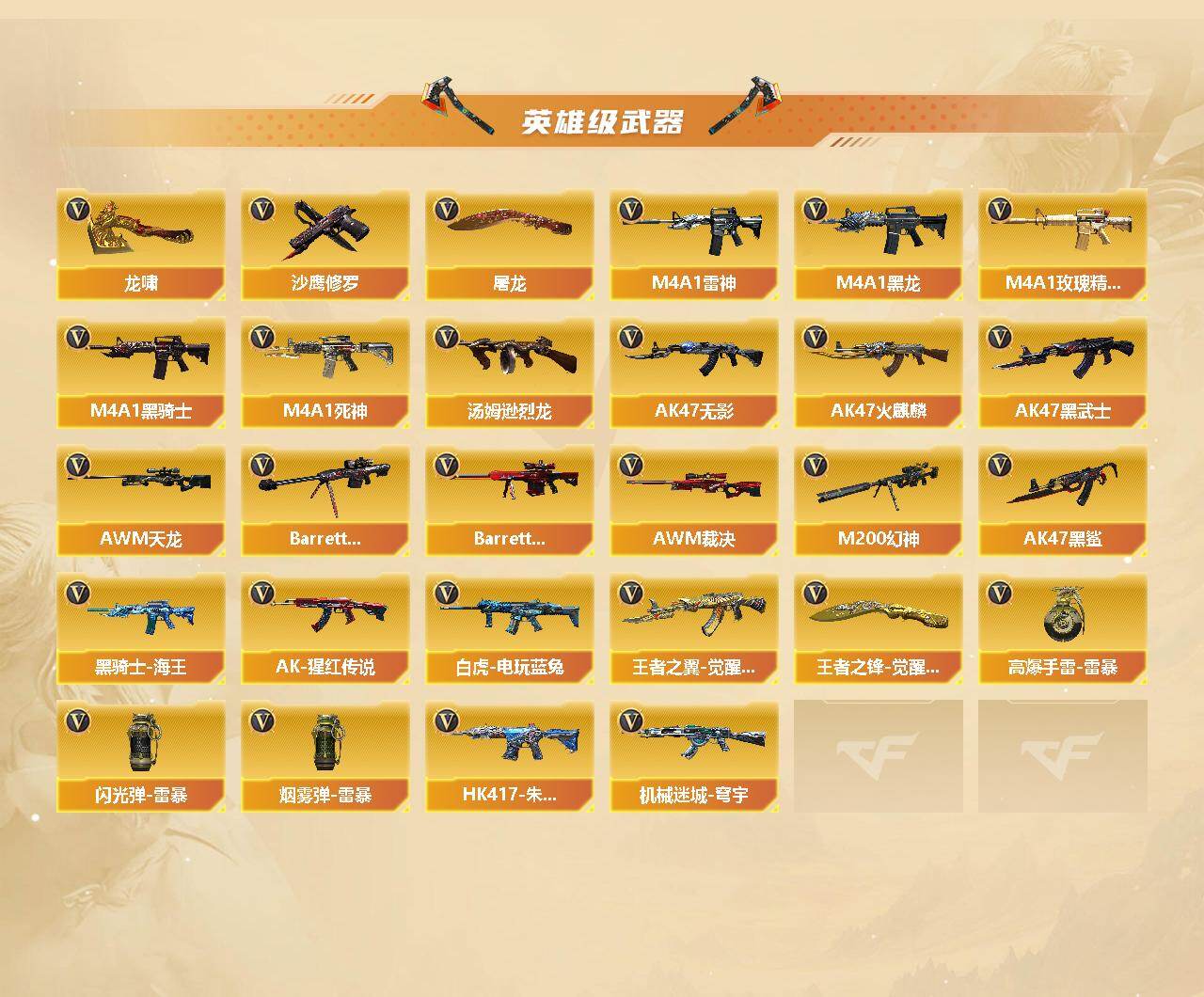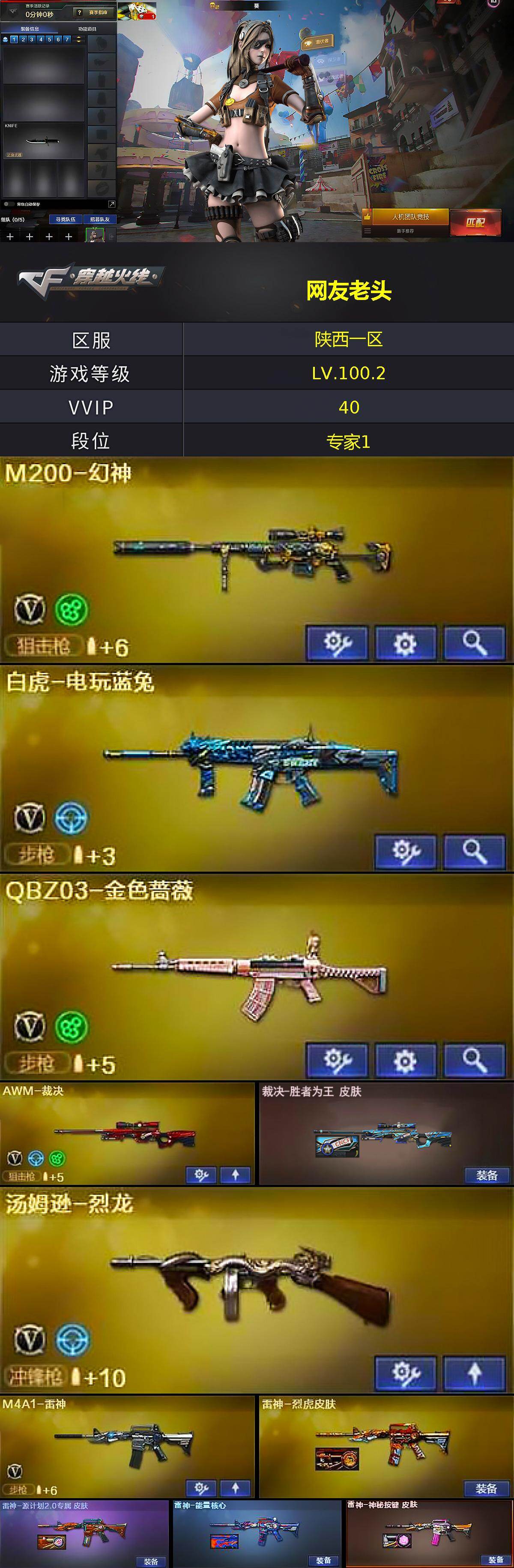 【热门武器】:QBZ03-金色蔷薇,M200-幻神,死亡之眼,白虎-电玩蓝兔,M4A1-黑骑士,汤姆逊-烈龙,沙鹰-修罗*2,金刚伞