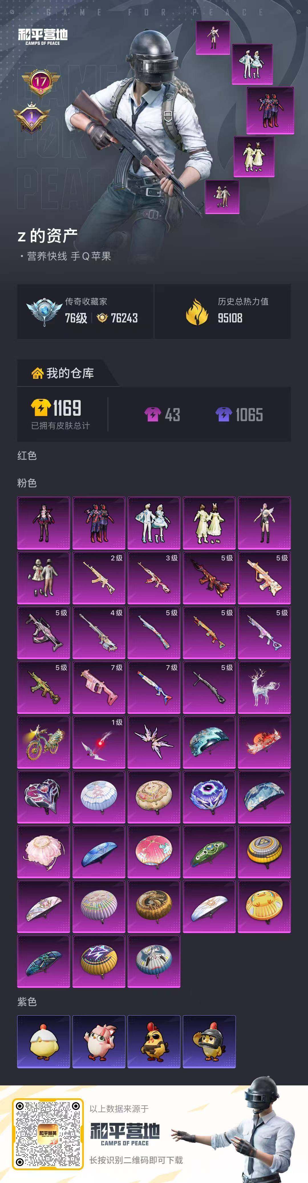 苹果 手Q-6粉装-13特效枪-2载具-2粉色飞行器-95163热力值-17王牌印记-231套装-303枪皮