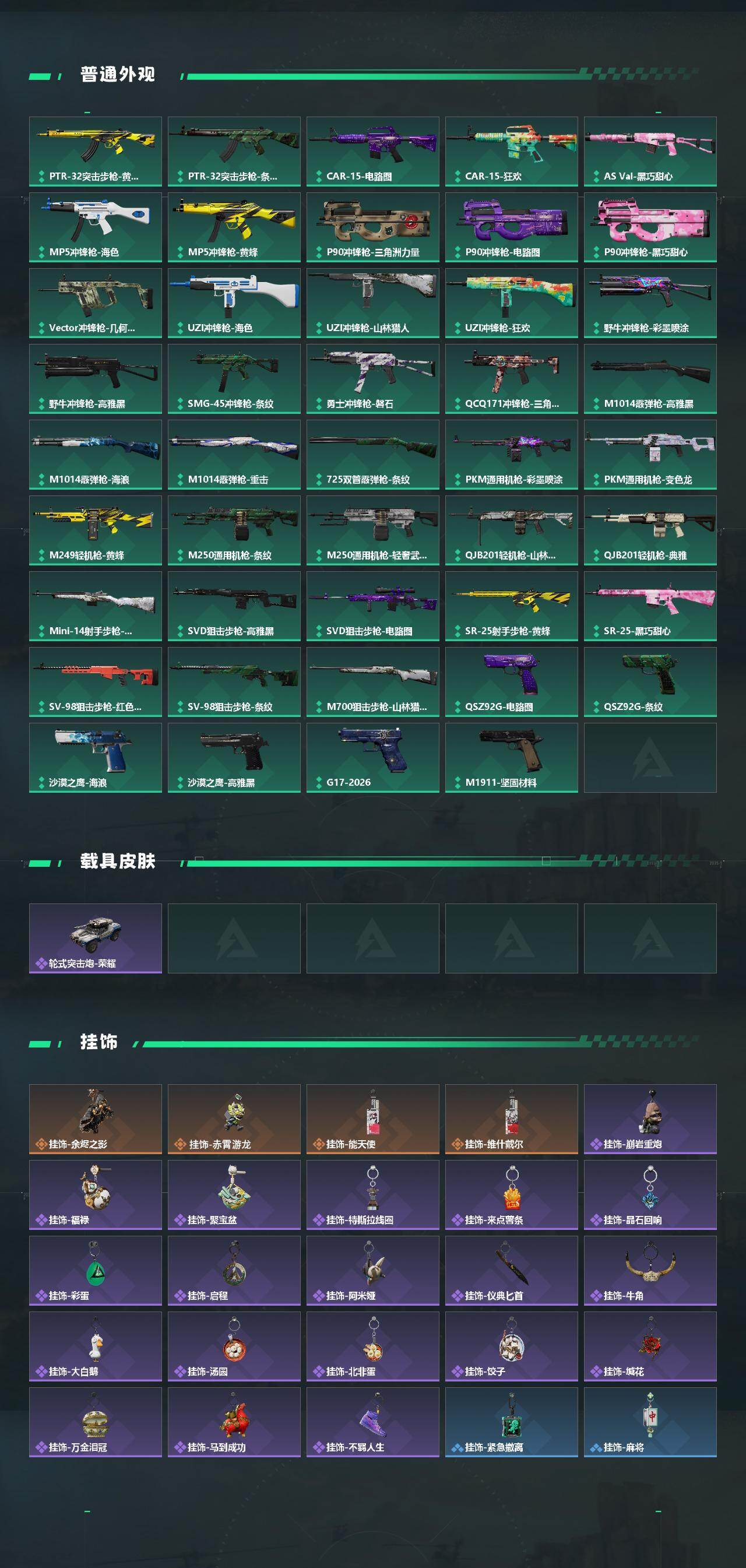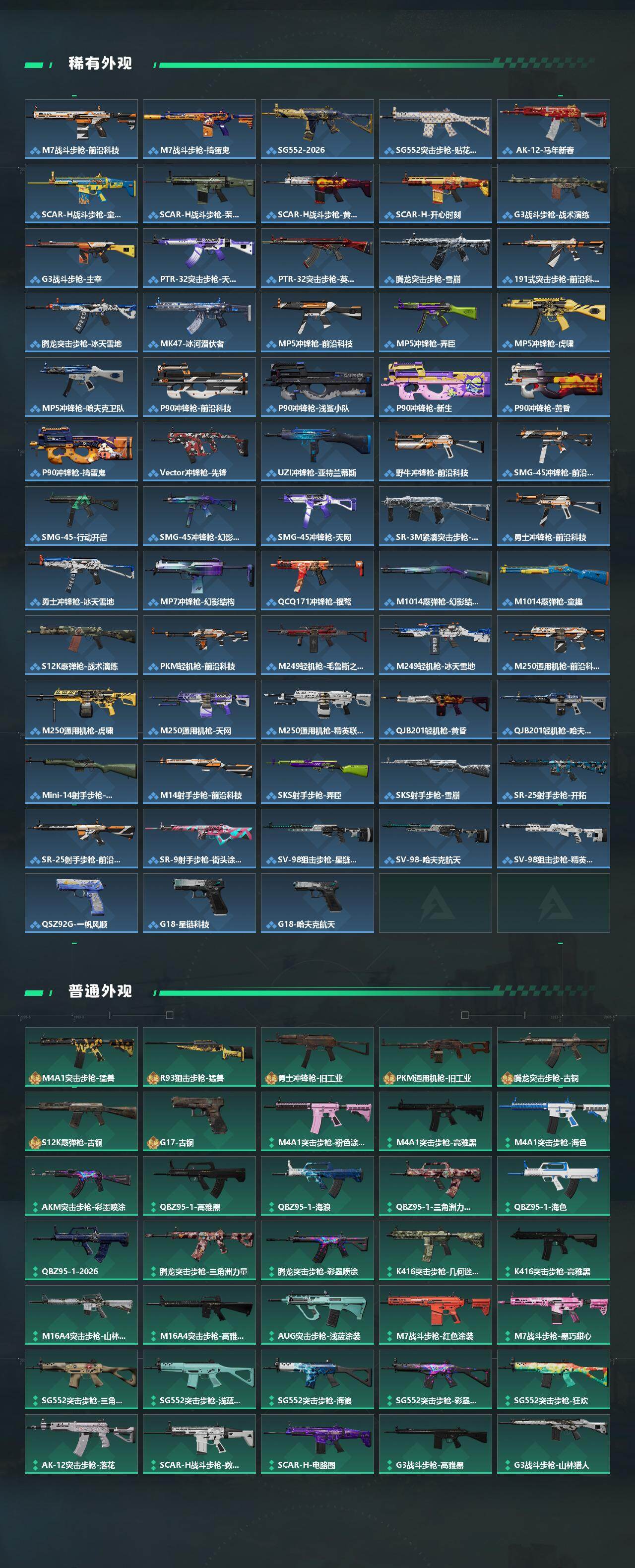 【传说外观】:M4A1突击步枪-蚀金玫瑰,M4A1突击步枪-阿米娅,ASh-12战斗步枪-鹅鸭杀,M7战斗步枪-怜悯,M7战斗步枪-巳蛇,AK-12突击步枪-特斯拉线圈,SCAR-H战斗步枪-启航,G3战斗步枪