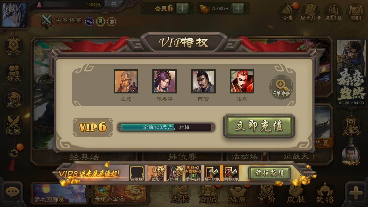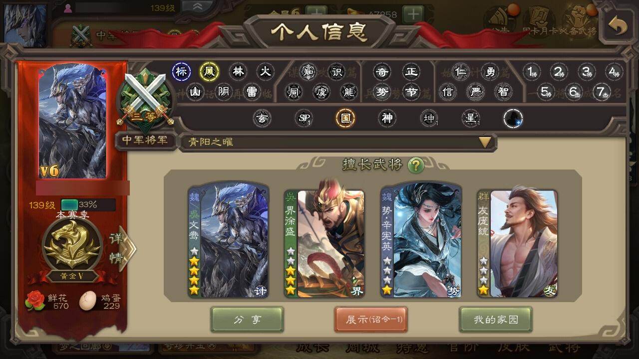 官阶:中军将军;VIP等级:VIP6;史诗武将数量:7;动态皮肤数量:4;武将