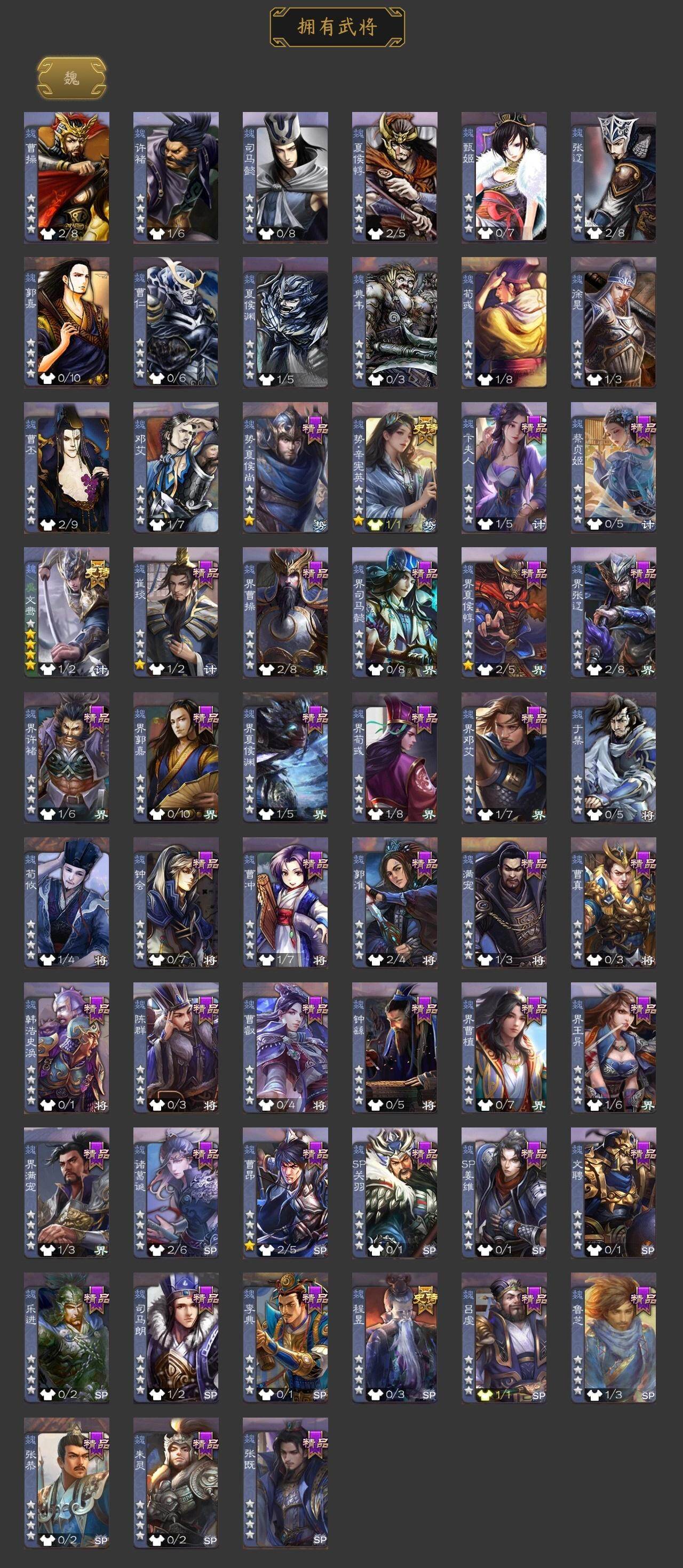 神赵云,势辛宪英,程昱,马云騄,谯周,界徐盛,文鸯,神吕蒙,势夏侯尚,SP关羽,乐进,曹昂,诸葛诞,朱灵,文聘,SP姜维,钟会,曹冲,郭淮,满宠,界王异,界曹操,界司马懿,界夏侯惇,界张