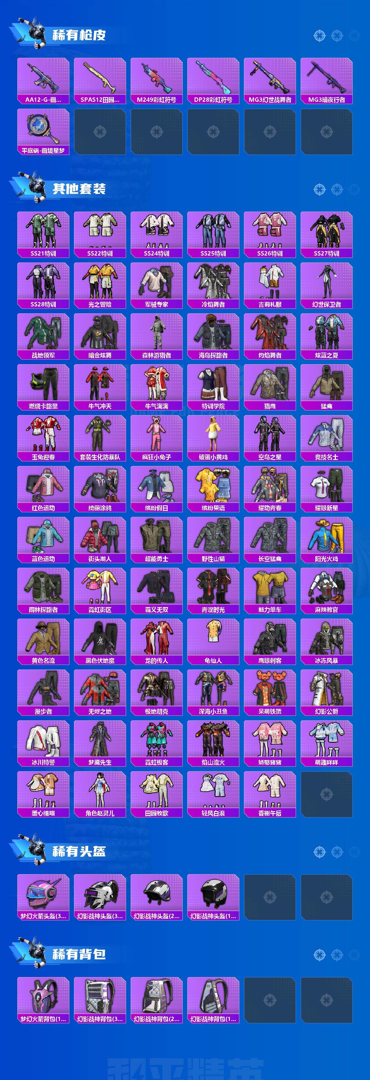 (4粉套6粉枪1载具)地铁马上满天赋/都市猎人/深海小丑鱼/暗夜行者/龟仙人/幻影战神/木曜青龙/金风银杏/复仇流浪者/M4五爪金龙七级/UMP45萌骑冒险四级/AKS74U森灵之息四级/Kar98K巳巳如意五级/Mk14福马献瑞五级/DP28豹影疾电五级/玛莎拉蒂薄荷绿/没战神框/HP7073-0粉色飞行器-36166热力值-2王牌印记-101套装-113枪皮