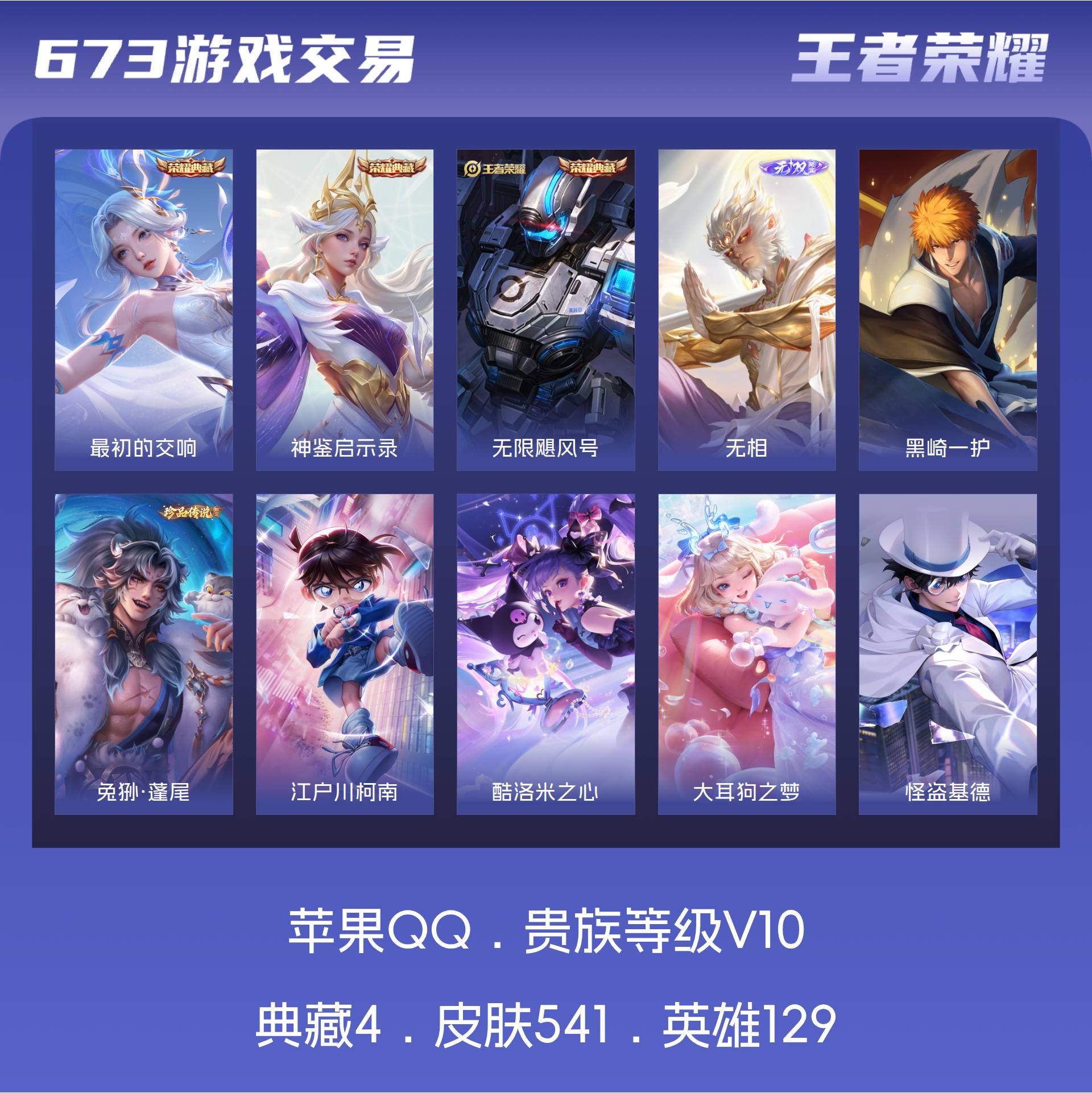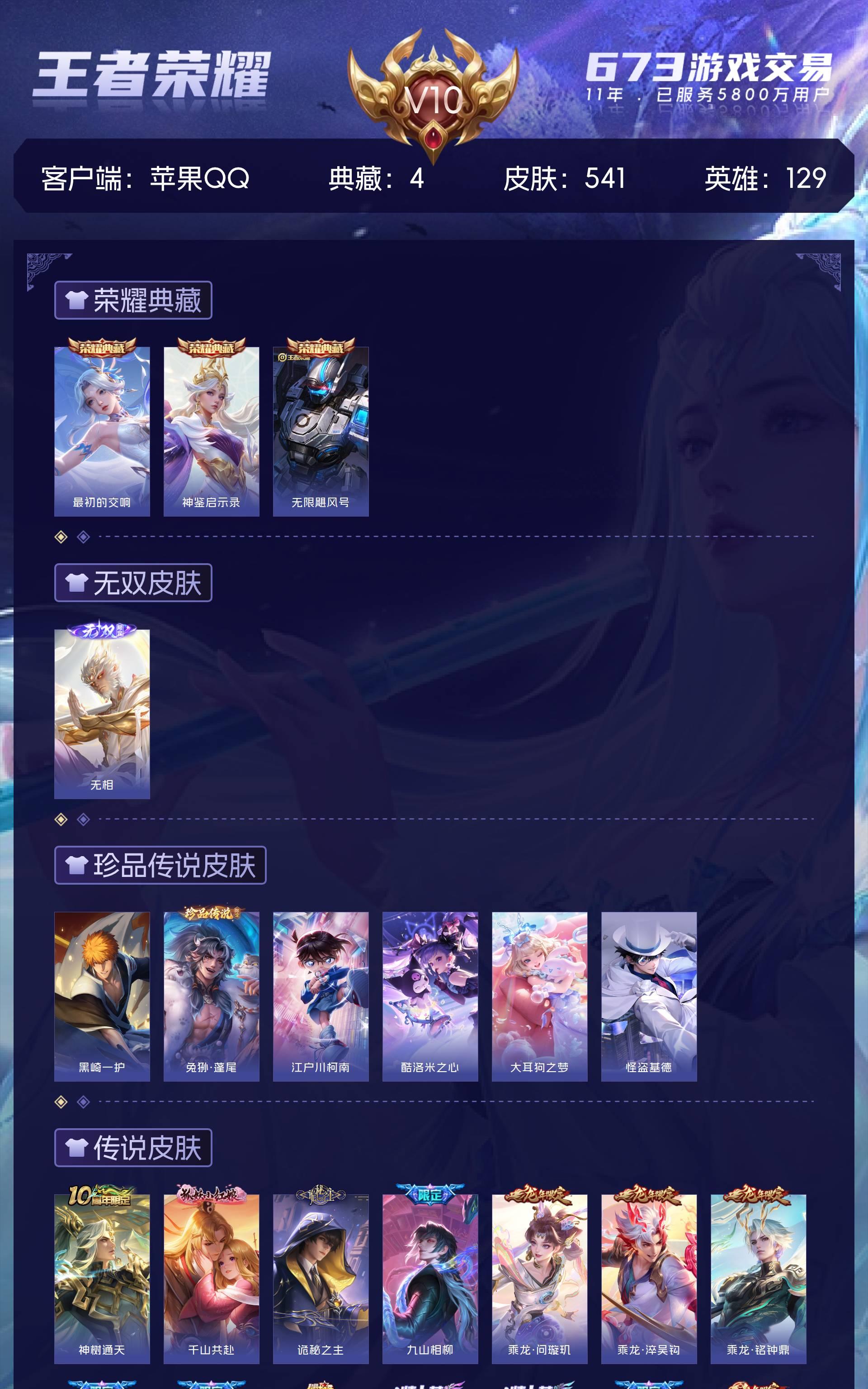 苹果QQ/荣耀王者/541皮肤/129英雄/3典藏/0珍品无双/1无双/6珍品传说/62传说/179