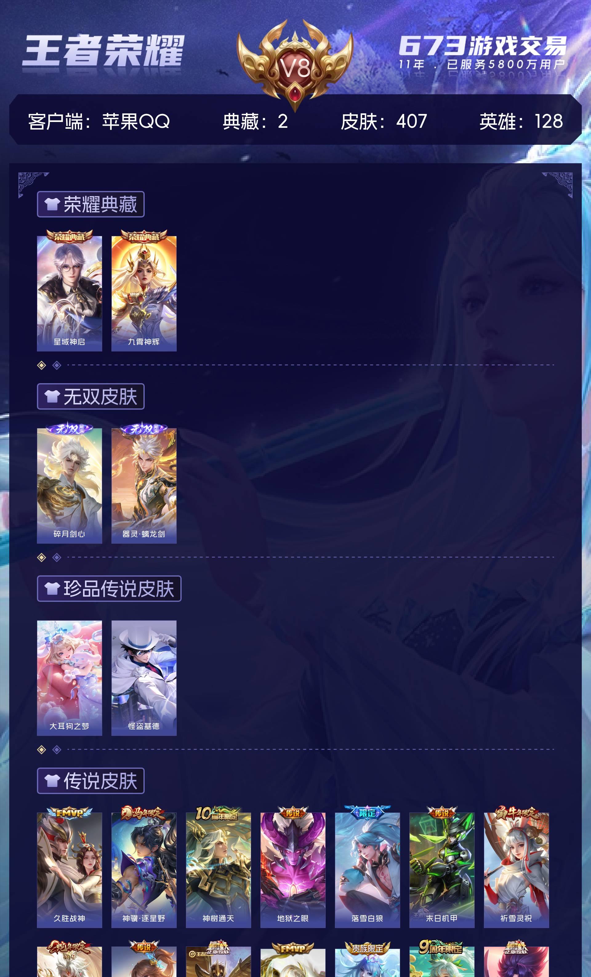 苹果QQ/最强王者/407皮肤/128英雄/2典藏/0珍品无双/2无双/2珍品传说/22传说/117