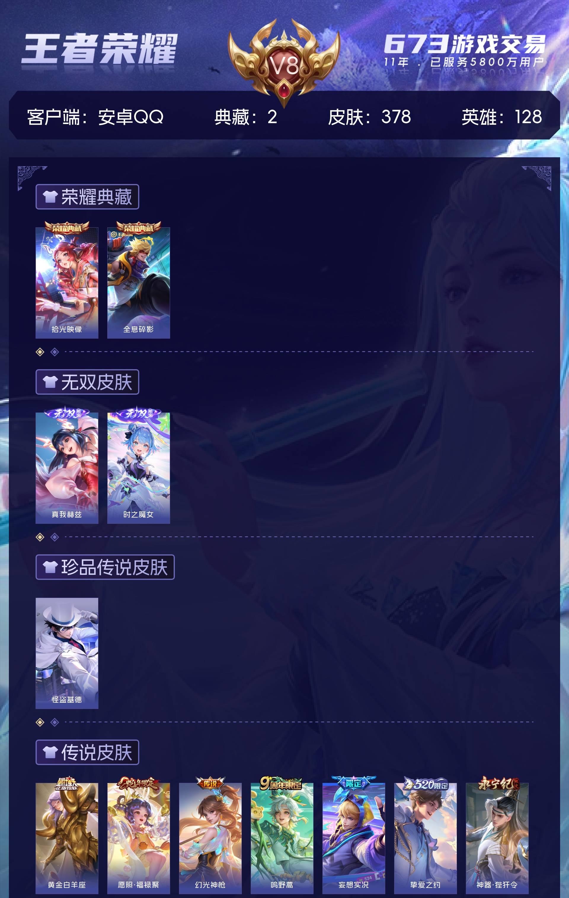 安卓QQ/永恒钻石/378皮肤/128英雄/2典藏/0珍品无双/2无双/1珍品传说/29传说/106