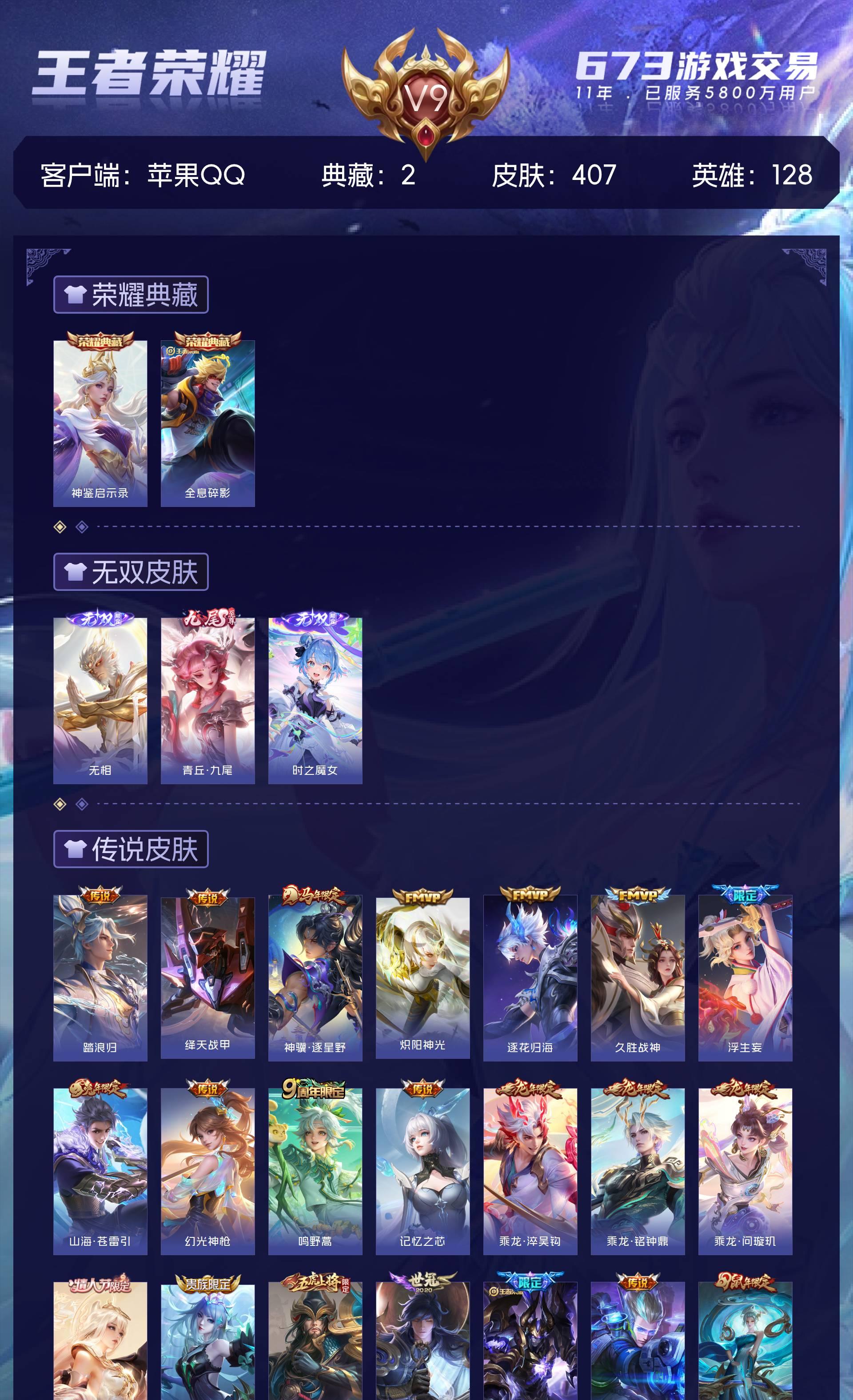 苹果QQ/非凡王者/407皮肤/128英雄/2典藏/0珍品无双/3无双/0珍品传说/31传说/124