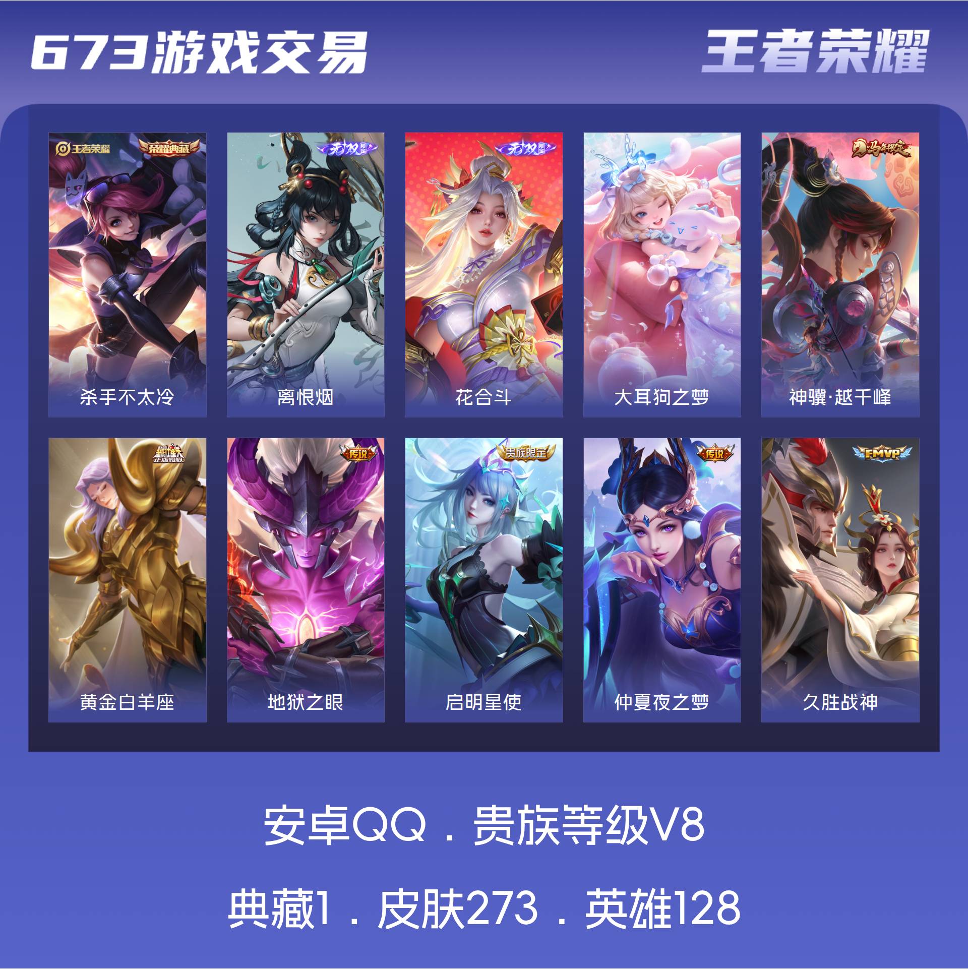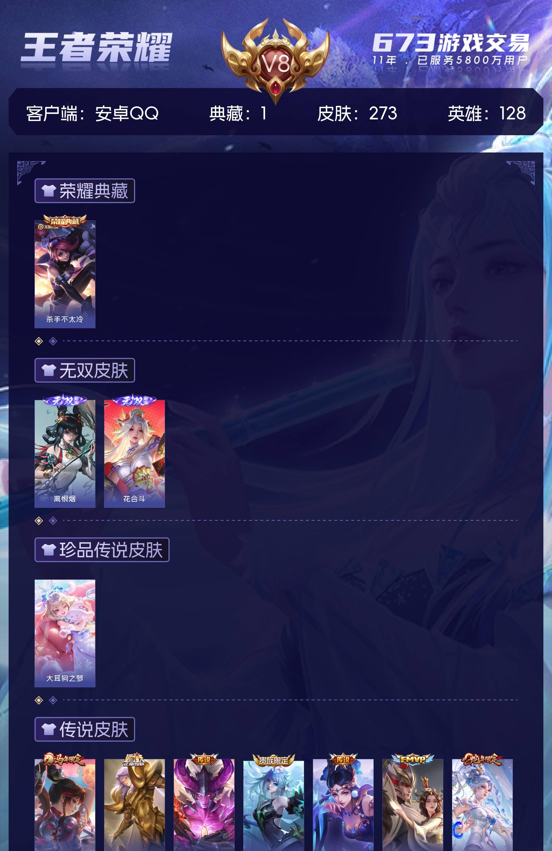 安卓QQ/无双王者/273皮肤/128英雄/1典藏/0珍品无双/2无双/1珍品传说/18传说/72史