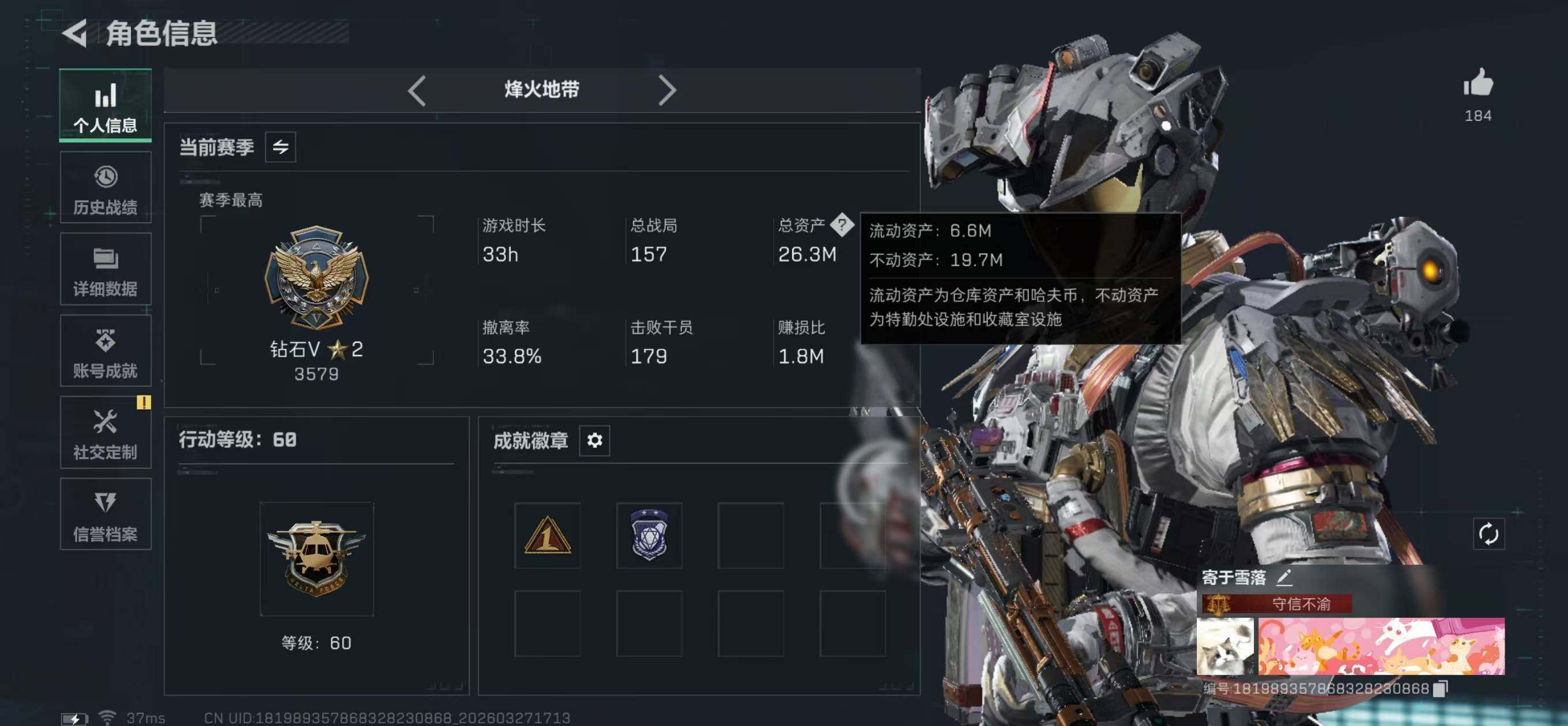 26m总资产-176k哈夫币-60烽火等级-钻石-2战场等级-无军衔 YY20
