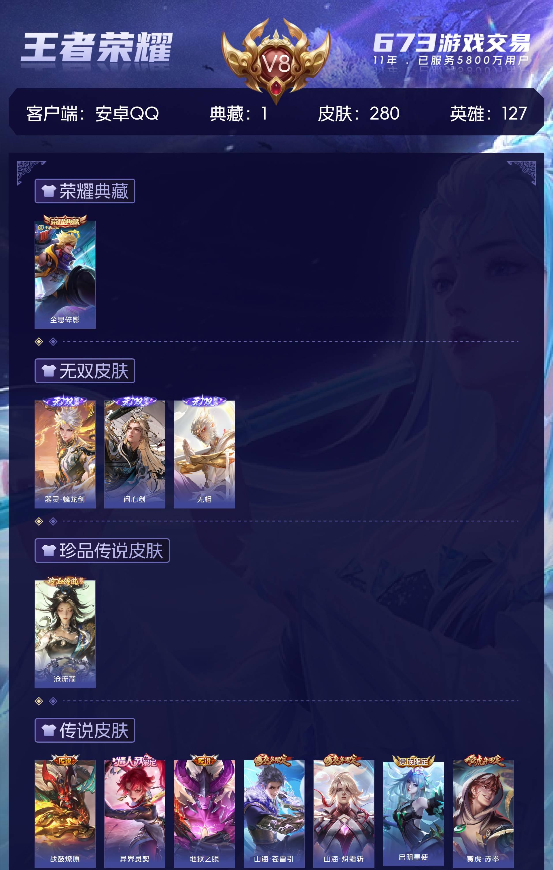 安卓QQ/至尊星耀/280皮肤/127英雄/1典藏/0珍品无双/3无双/1珍品传说/12传说/74史